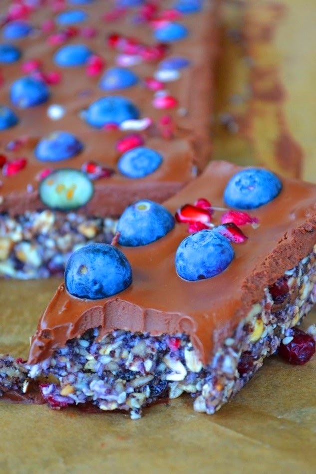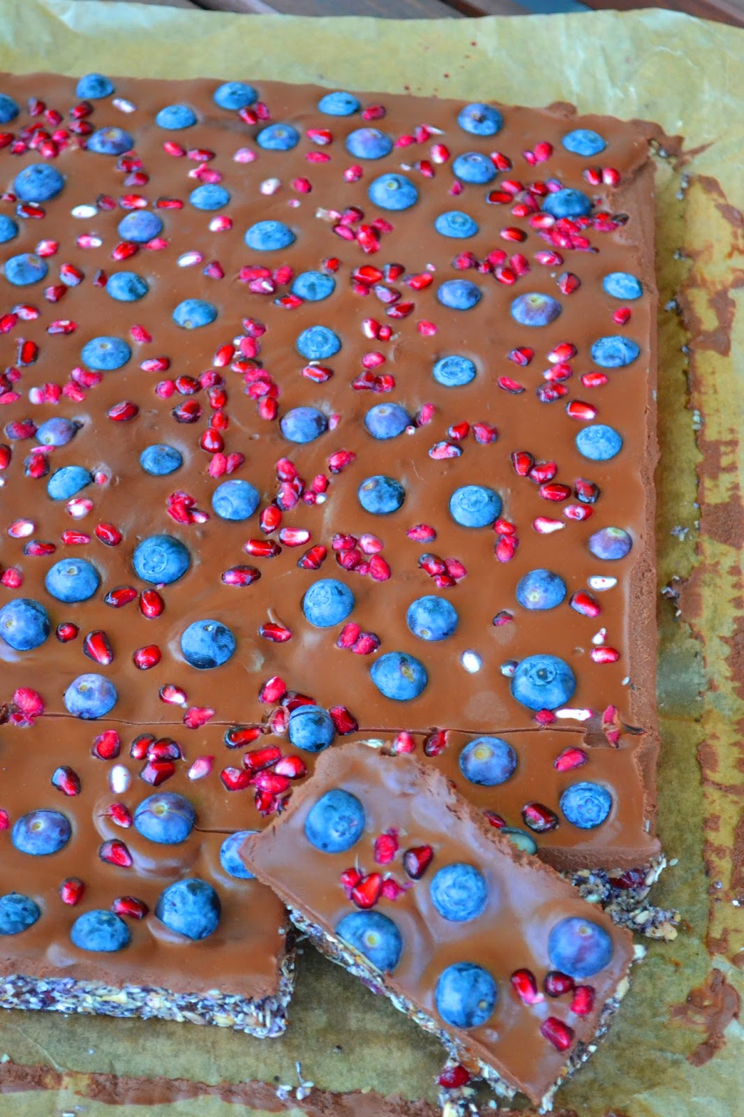 Baton ma dwie warstwy. Dolna orzechowa, ziarnista, makowa i z suszonych owoców oraz warstwę z czekolady z dodatkiem karobu a na wierzchu borówki i nasiona granatu. Podana ilość jest na sporą blachę (taka jak do piekarnika).