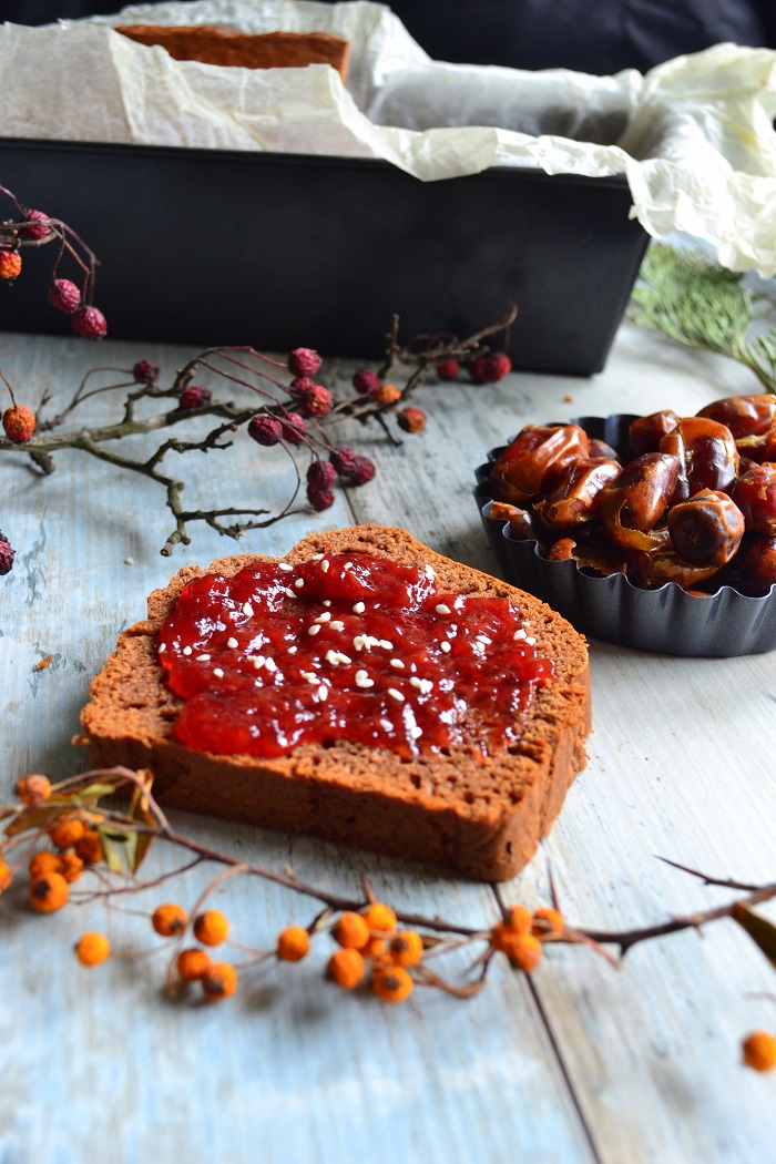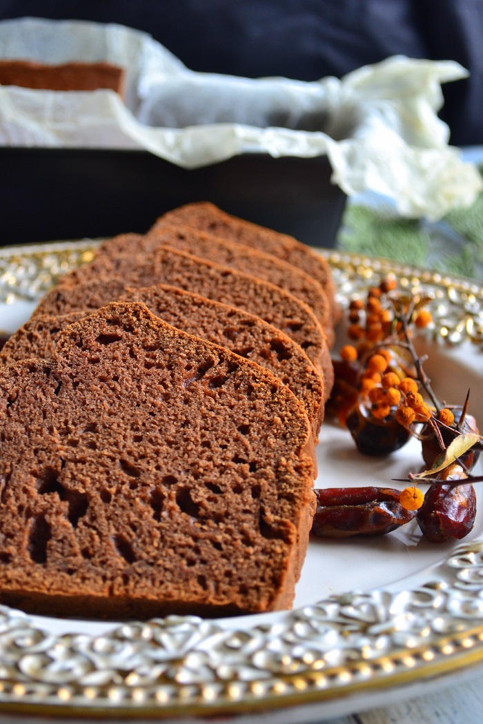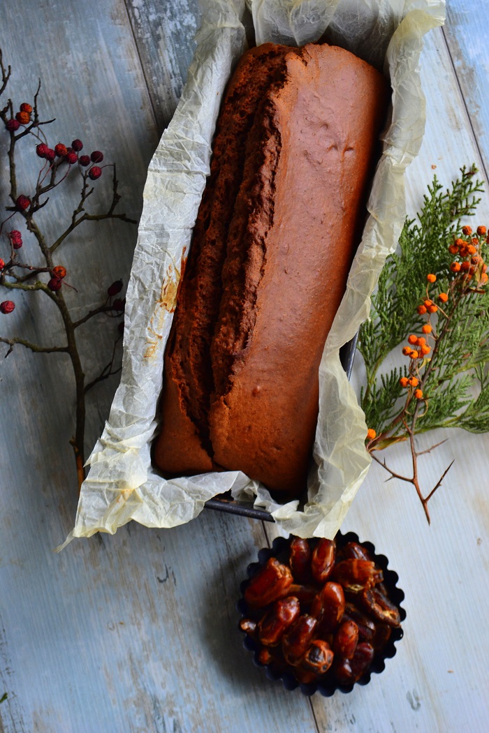 Oprócz mojego ulubionego chlebka bananowego jest jeszcze ten – daktylowy. Zawiera mus z tego przepisu. Ciasto ma smak lekko karmelowy. Dzięki korzennym przyprawom przypomina w smaku piernika, ale ilość ich nie jest duża.