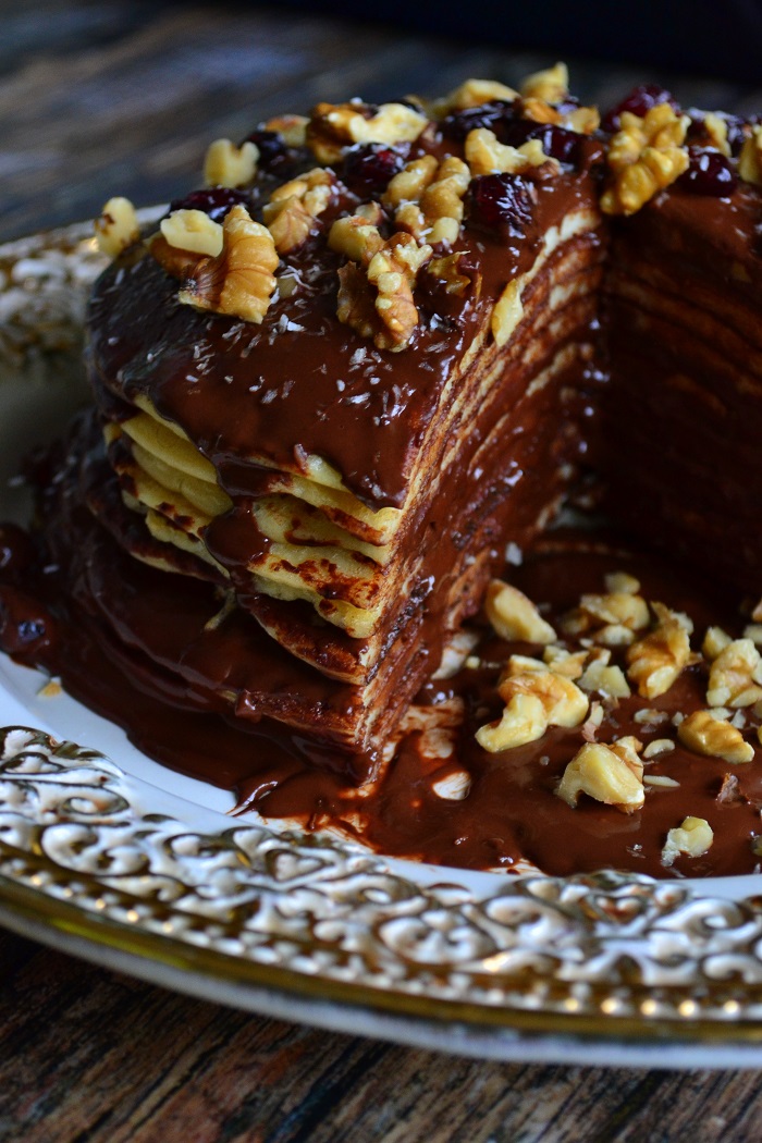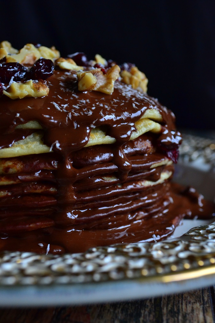 W tym daniu połączyłem dwa ulubione składniki. Czekoladę i naleśniki. Przygotowanie zajmuje parę chwil. Placki przekładane płynną czekolada i siekanymi orzechami to coś, co mnie stawia na nogi.