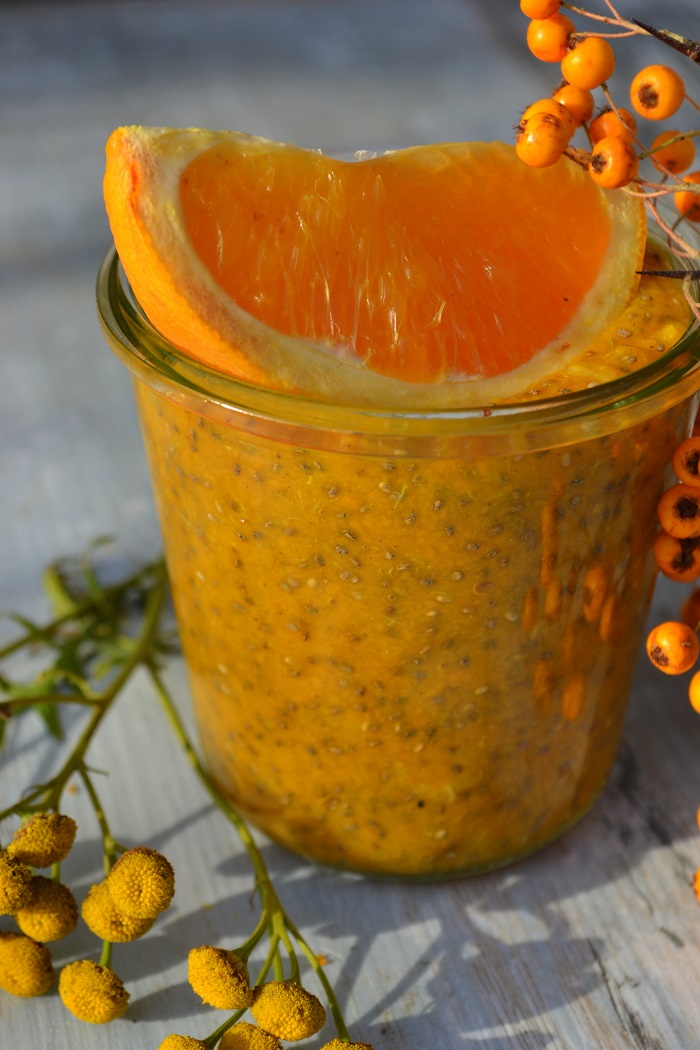 - Dynię obrać ze skórki - z pomarańczy zetrzeć skórkę do małego garnka i obrać z pozostałej skórki- za pomocą blendera dokładnie zmiksować dynię wraz z pomarańczami- dodać cynamon i kardamon- na małym ogniu gotować około 5 minut- dodać syrop do smaku i sok z cytryny- na szklankę przygotowanej masy, dodać 2 łyżki nasion chia i dokładnie wymieszać- odstawić na minimum godzinę i gotowe :)