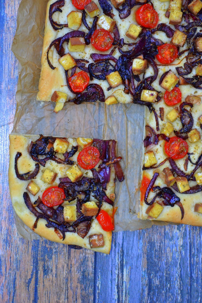 FOCACCIA Z KARMELIZOWANĄ CEBULĄ I WĘDZONYM TOFU
