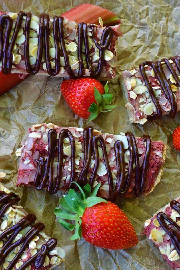 Spód batonów to mieszanka płatków owsianych i jaglanych z bananem a warstwa owocowa to połączenie rabarbaru z truskawkami i nasionami chia dla gęstości no i smaku.