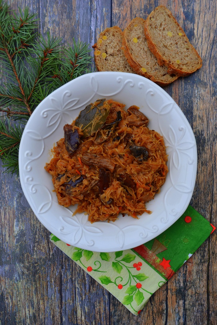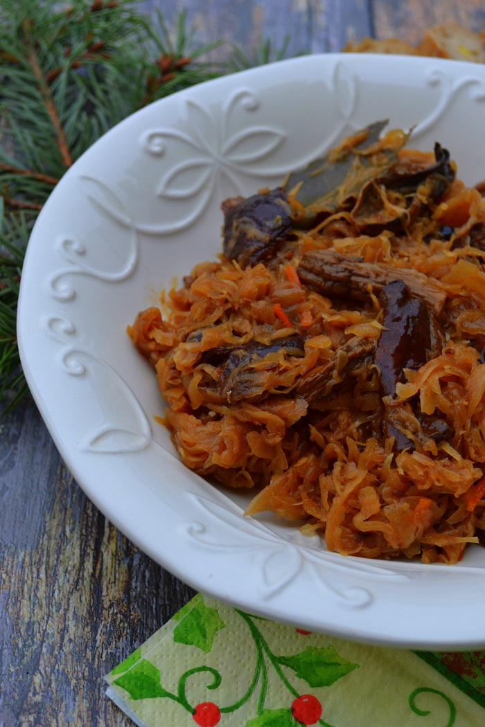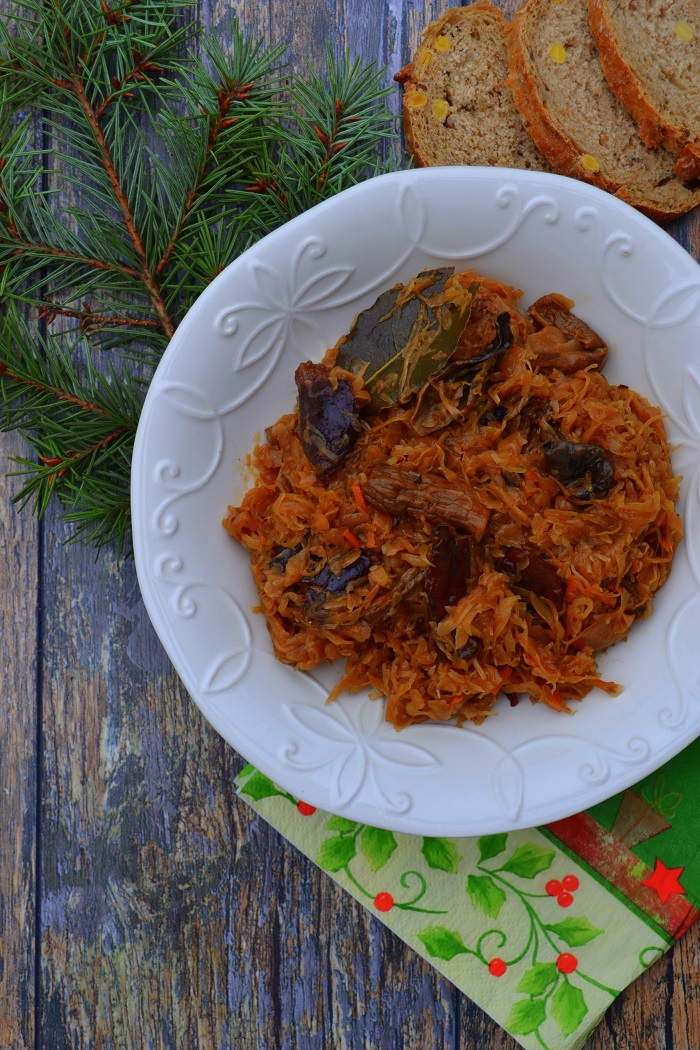 - 3 kg kiszonej kapusty (naturalnie bez octu)- 2 duże garście dowolnych, suszonych grzybów- 10 suszonych, wędzonych śliwek lub suszonych i wtedy łyżeczka wędzonej papryki- 5 ziaren ziela angielskiego- 5 ziaren jałowca- łyżeczka cząbru- łyżeczka kminku- 3 liście laurowe- 5 ziaren pieprzu- łyżeczka suszonego rozmarynu lub gałązka świeżego- pół szklanki słodkiego, czerwonego wina- ewentualnie sól do smakuWYKONANIE: