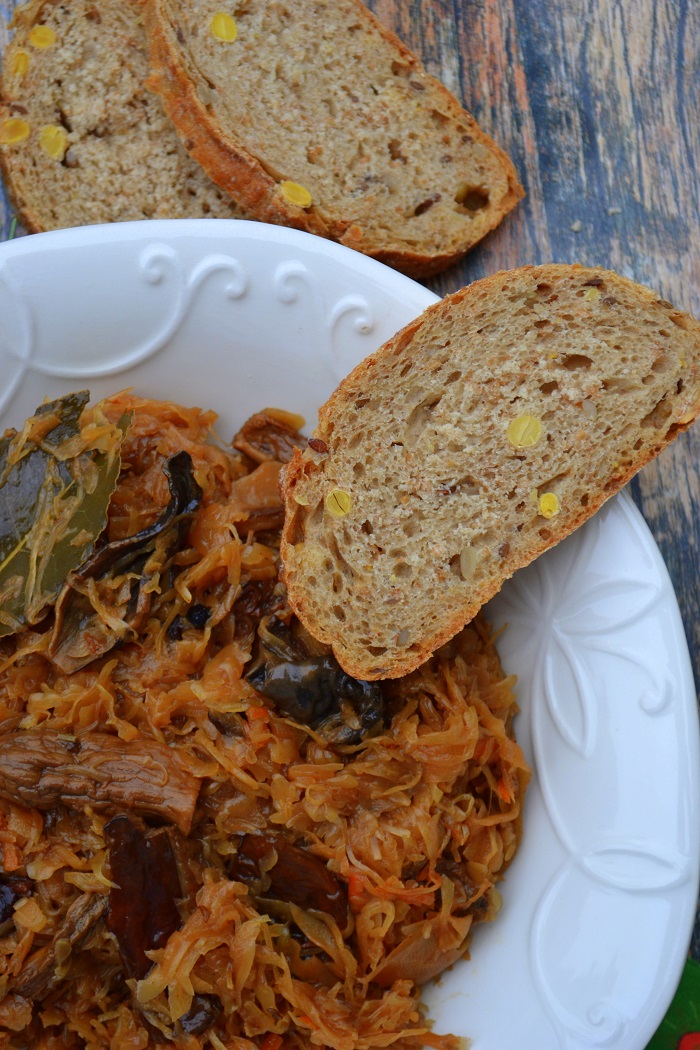 - 3 kg kiszonej kapusty (naturalnie bez octu)- 2 duże garście dowolnych, suszonych grzybów- 10 suszonych, wędzonych śliwek lub suszonych i wtedy łyżeczka wędzonej papryki- 5 ziaren ziela angielskiego- 5 ziaren jałowca- łyżeczka cząbru- łyżeczka kminku- 3 liście laurowe- 5 ziaren pieprzu- łyżeczka suszonego rozmarynu lub gałązka świeżego- pół szklanki słodkiego, czerwonego wina- ewentualnie sól do smakuWYKONANIE: