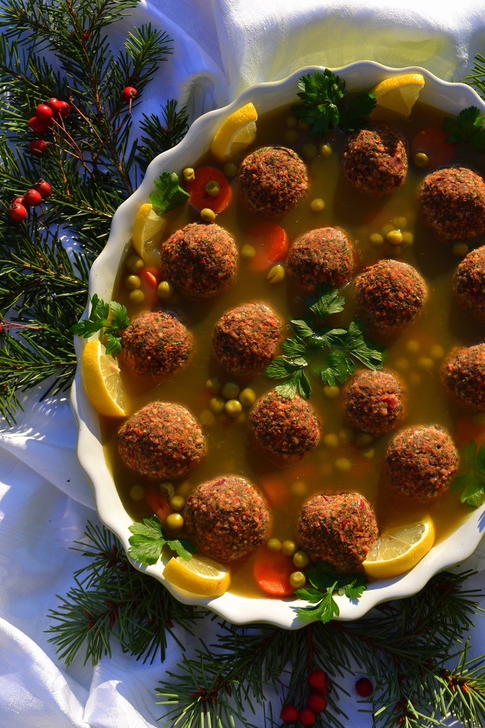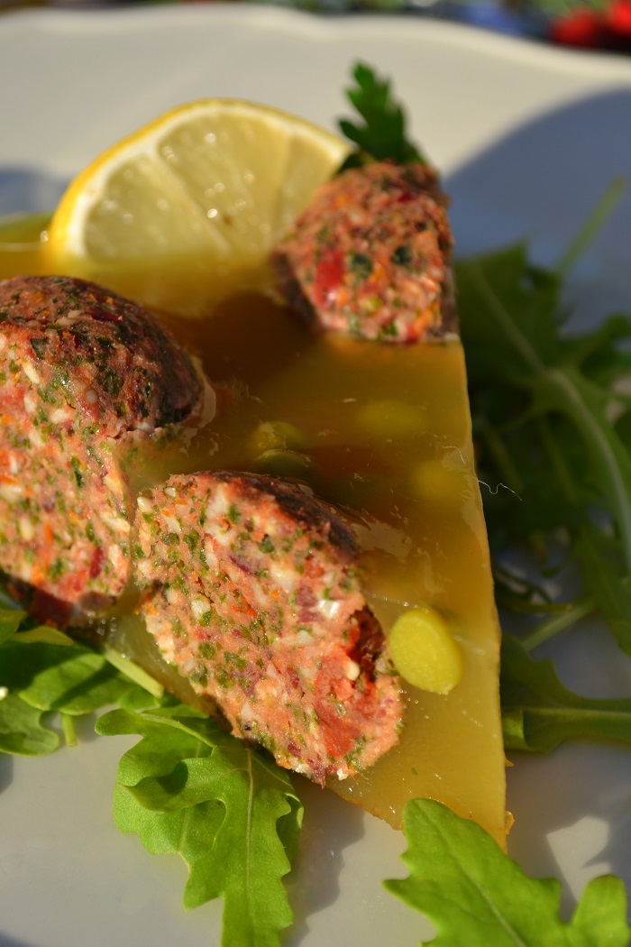 Jeżeli chodzi o galaretkę, to nie ma problemu. Uzyskiwany z morskich glonów agar, jest wegańska formą żelatyny. Jaka jest jego przewaga? Nie pochodzi z niewiadomego źródła kostnego. I co ważne, ścina się już na ciepło. Ilość agaru jakiej używam, to 1 łyżeczka na szklankę rosołu.