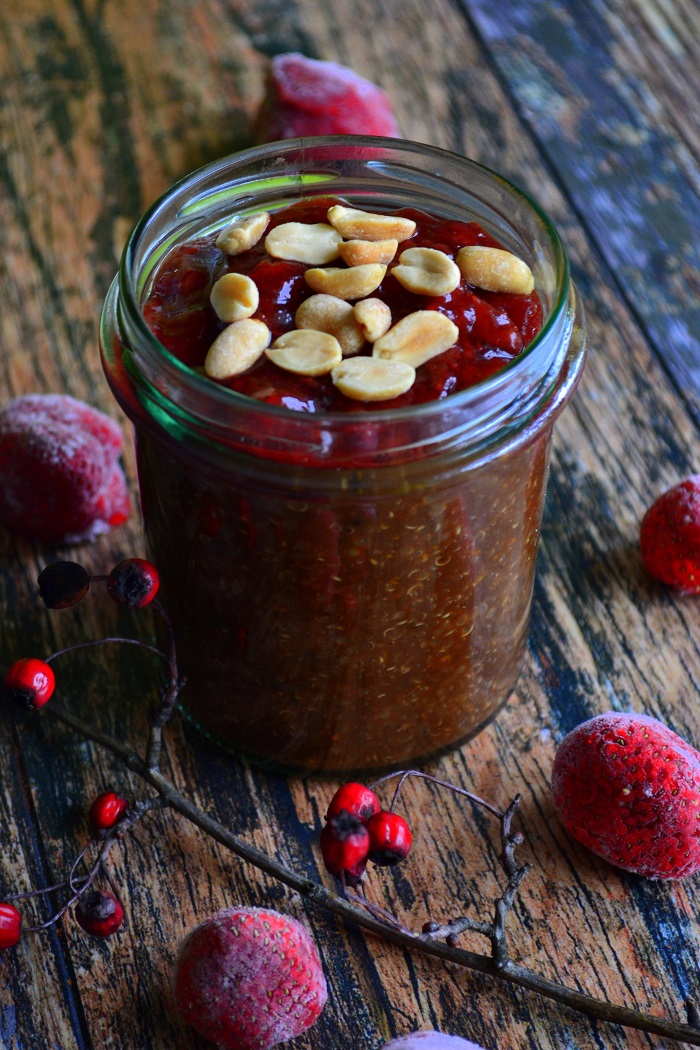 Oprócz komosy ugotowanej na mleku kokosowym, jest rozpuszczalna kawa z cykorią, konfitura truskawkowa i karob. By forma była bardziej gęsta, dodałem trochę mąki ziemniaczanej. Dla świeżości, startej skórki pomarańczowej.