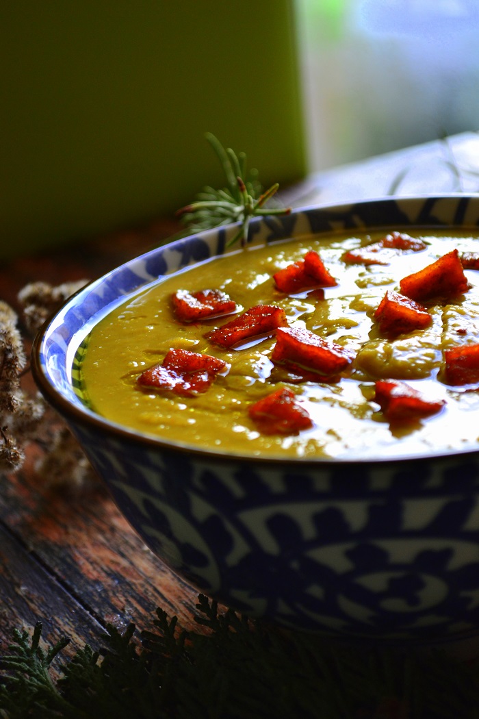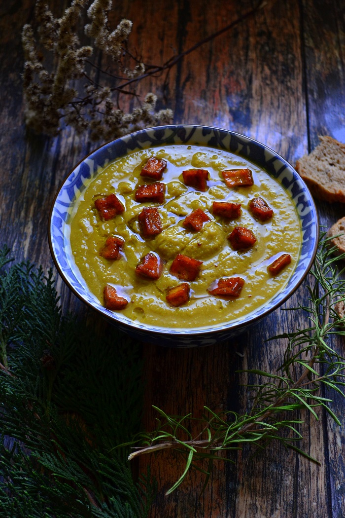 - pół kg suszonego zielonego grochu- kostka wędzonego tofu ok. 200 g- łyżeczka wędzonej, słodkiej papryki w proszku- łyżka curry- łyżeczka majeranku- łyżeczka mielonych ziaren kolendry- łyżeczka mielonego kminu rzymskiego- 3-4 łyżki mleka kokosowego- sól i pieprz do smaku