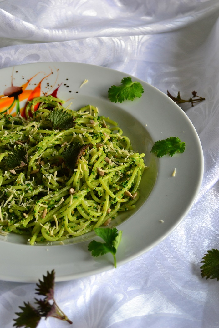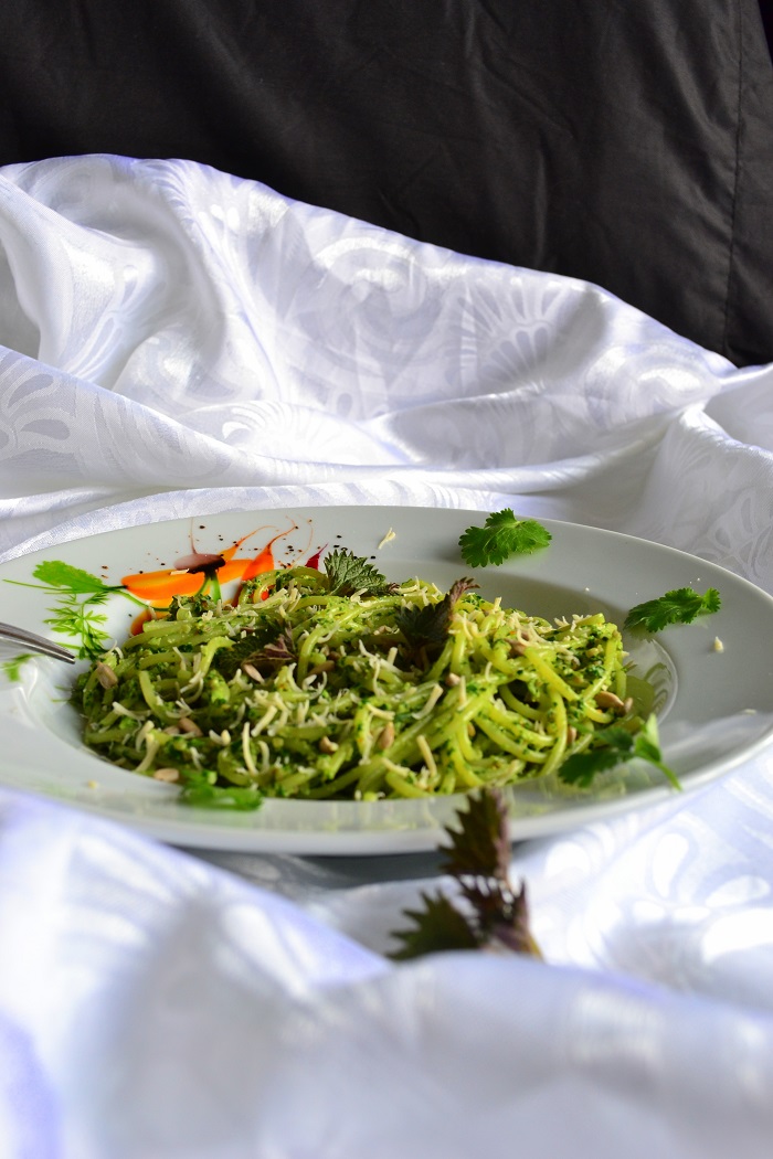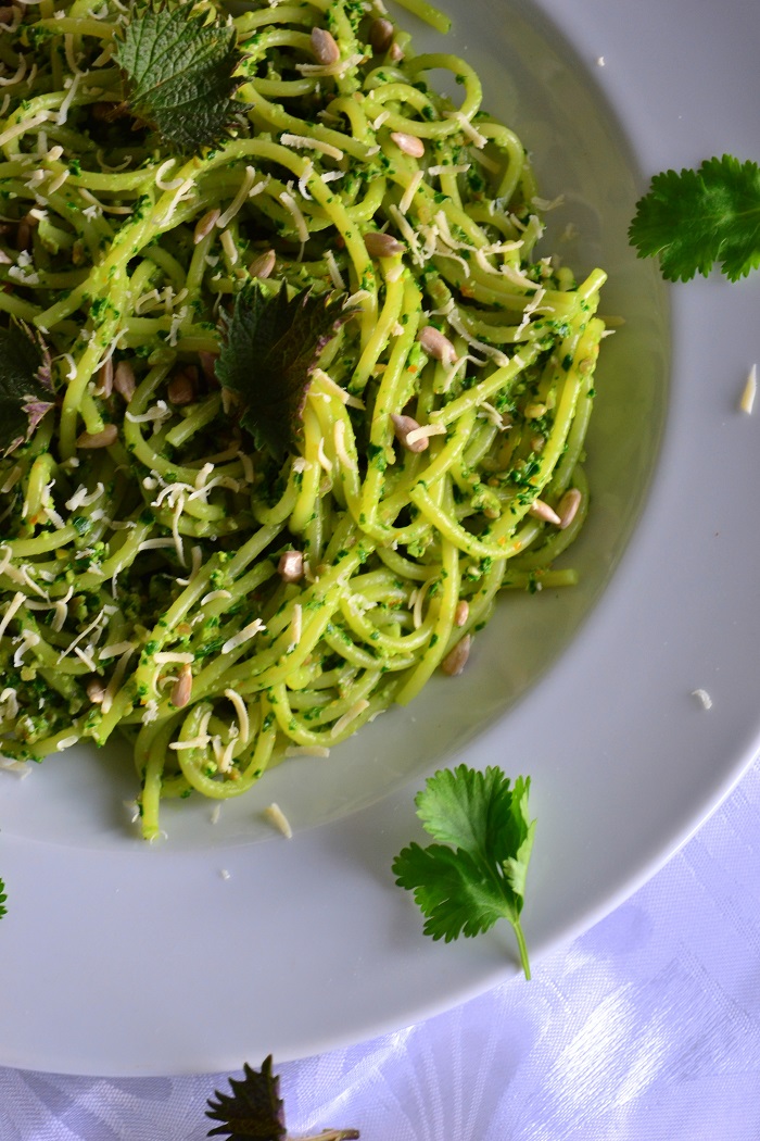 W tym pesto znalazła się pokrzywa, szczaw, mniszek, jasnota i krwawnik. Tego ostatnie używamy w małych ilościach. Wystarczy wszystko zmiksować z oliwkami, słonecznikiem i dodatkami. Do tego dowolny makaron i obiad w parę chwil.