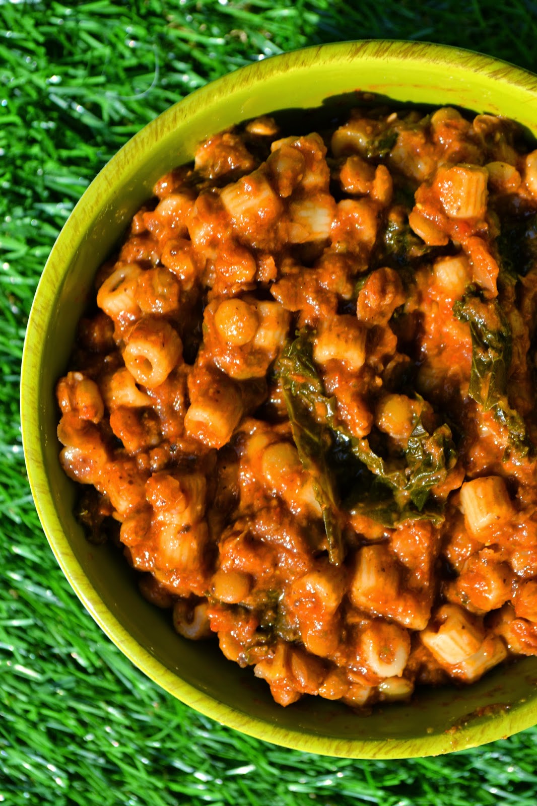Moja propozycja na wykorzystanie popularnej pokrzywy i mniej popularnego czosnaczka i przytulii to potrawka, gdzie chwasty są zatopione w sosie pomidorowym, soczewicy i fikuśnym makaronie ditalini rigati, który jest wykorzystywany we Włoszech do gęstych zup warzywnych i właśnie potrawek ze strączkami. Czosnaczek ma lekko czosnkowy smak (stąd ta nazwa) i jest bardzo popularnym chwastem, natomiast przytulii nie sposób ominąć gdyż swoimi haczykami przypina się do spodni czy butów. Z przytulii wykorzystujemy młode listki ze szczytu rośliny i podobnie w przypadku czosnaczka gdzie zbieramy go z roślin jeszcze nie kwitnących.