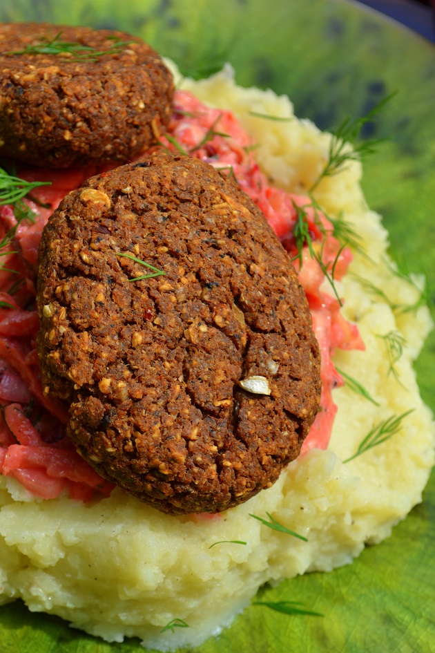 Zaczynamy od kotletów. To mieszanka kaszy gryczanej niepalonej, suszonych pomidorów, grzybów, płatków owsianych i przypraw. Kotlety były pieczone.