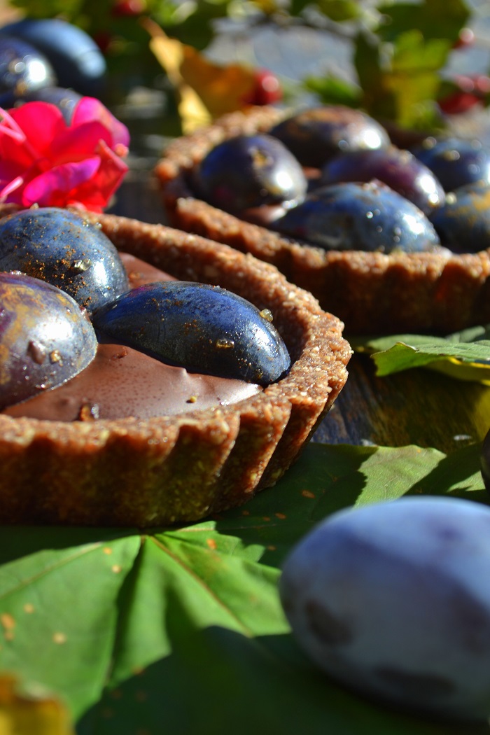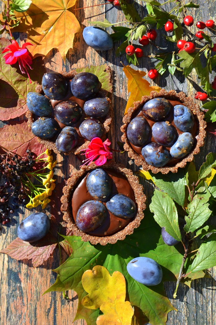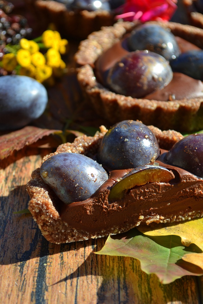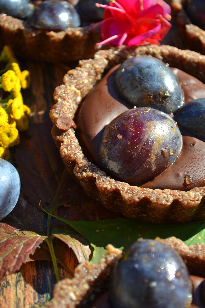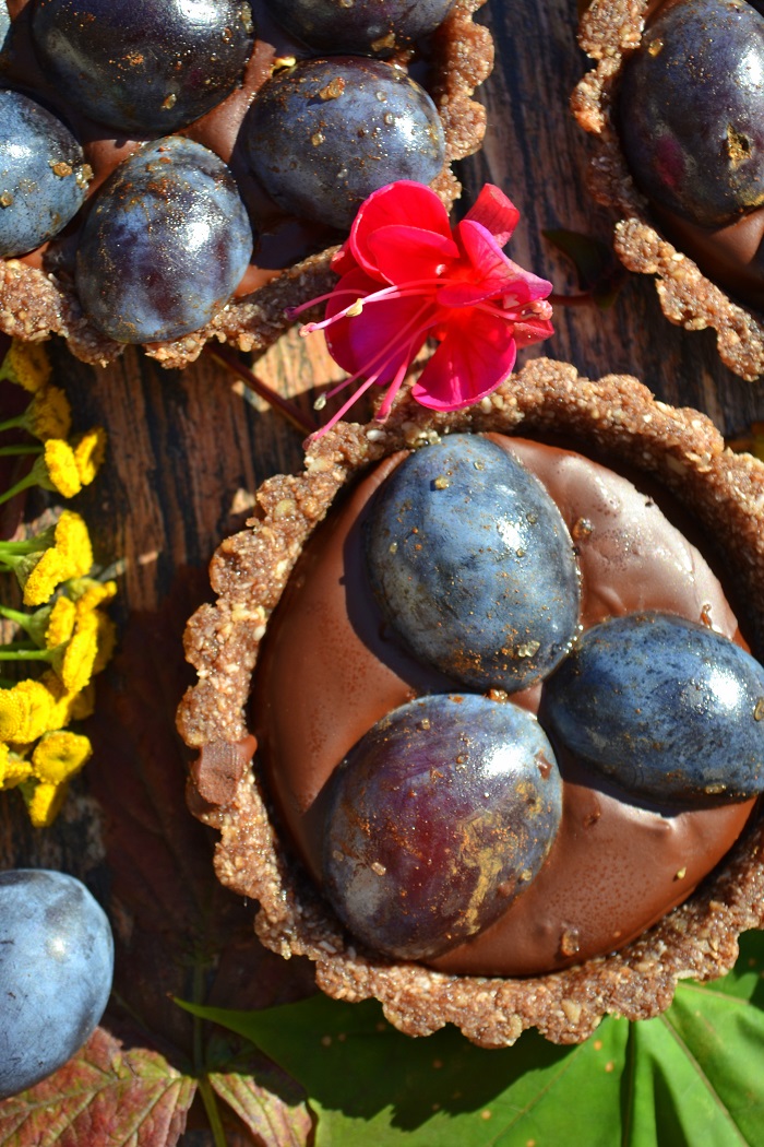 Spód standardowy. Zmielone suche ziarna połączone bananem. Krem też nie jest jakiś ekstrawagancki. Czekolada z kremem kokosowym. Śliwki wcześniej wymieszałem z cukrem trzcinowym i cynamonem. Te owoce uwielbiają korzenne przyprawy.