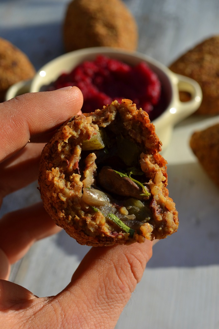 Nadzienie jest z grzybów i ogórków kiszonych z natką. Ważne jest by podczas zlepiania krokietów, nie było pęknięć.