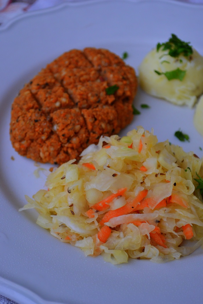 Surówka:- 0,5 kg kiszonej kapusty- 1 średnia marchewka- 1 mała cebula- 1 twardawa gruszka- łyżeczka nasion kminku- chlust oleju (ja używam lnianego)
