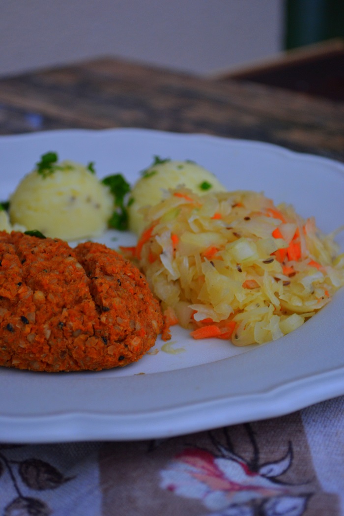 Kotlety:- ciecierzycę namoczyć około 10 godzin w wodzie i ugotować do miękkości. Wystudzić- kaszę ugotować pod przykryciem w 2 szklankach wody na małym ogniu (ok. 15 minut). Wystudzić- pomidory odcedzić z zalewy i zmiksować na gładko z ciecierzycą- dodać kaszę i przyprawy. Dokładnie wymieszać- formować kotlety, kłaść na papier do pieczenia- piec 20 minut w 200 stopniach- po upieczeniu odczekać chwilę. Kotlety po lekkim schłodzeniu stają się bardziej zwarteSurówka:- kapustę pokroić nożem na mniejsze włókna- gruszkę i cebulę pokroić w małą kostkę- marchewkę zetrzeć na grubych oczkach- wszystko dodać do miski, wsypać kminek, dodać olej i wymieszaćPuree:- ziemniaki ugotować razem z kalafiorem do miękkości. Odcedzić wodę- utłuc tłuczkiem i dodać pozostałe składniki