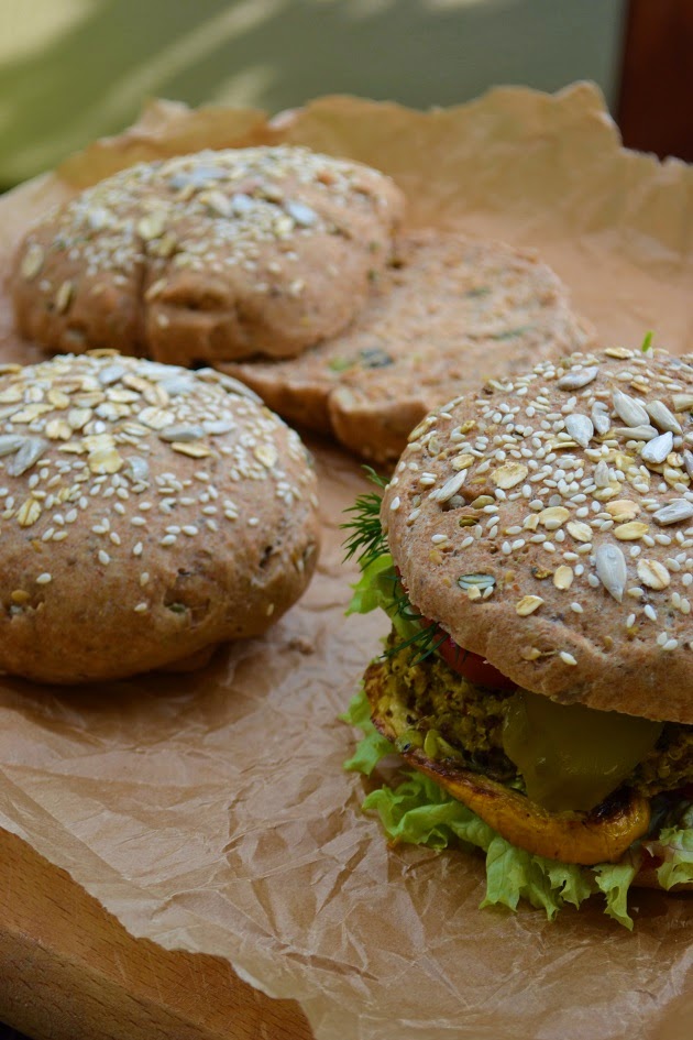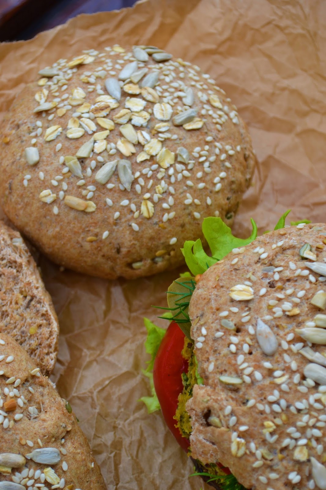Ja do wypieków stosuję drożdże suche, które nie wymagają robienia zaczynów co znacznie skraca czas przygotowania pieczywa. Ziarna znajdują się zarówno w środku jak i na zewnątrz. Dodaję również odrobinę syropu z agawy dla głębi smaku jak i jako pożywki dla drożdży. Bułki pieką się szybko. Reasumując czas przygotowania bułek od momentu zebrania składników do chwili upieczenia to nie więcej niż 2 godziny (to tyle co przygotowanie super wegeburgera)