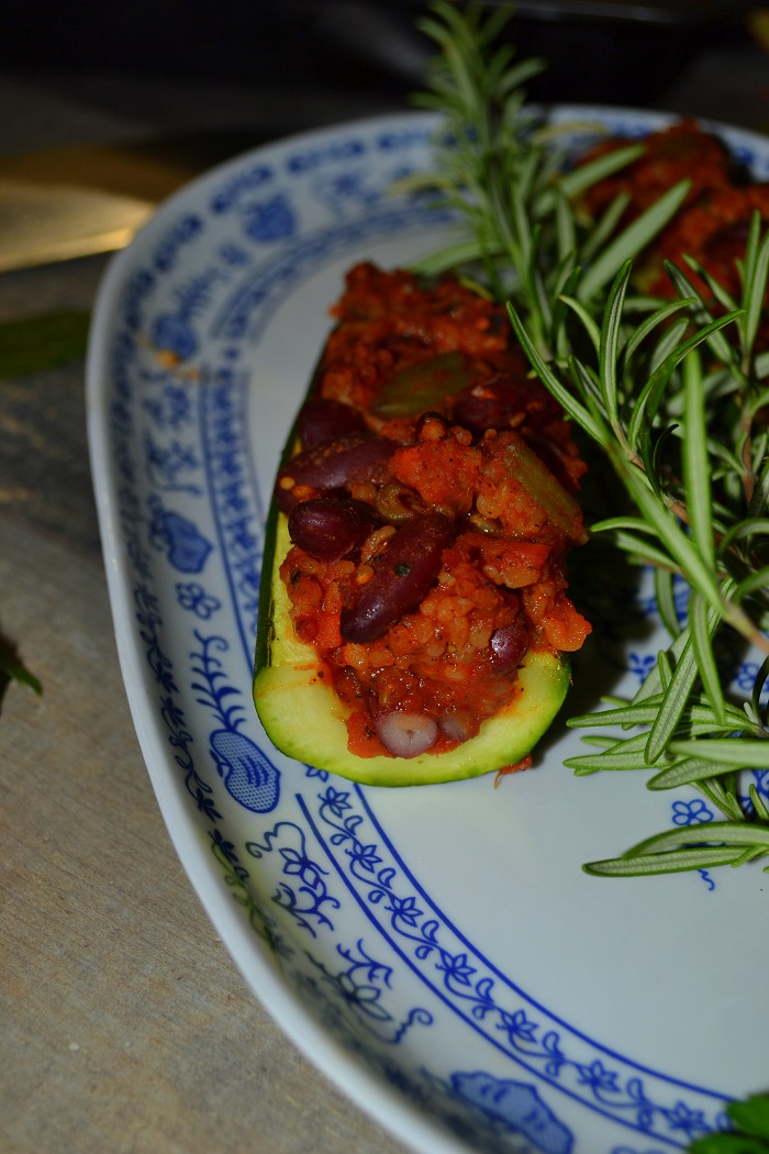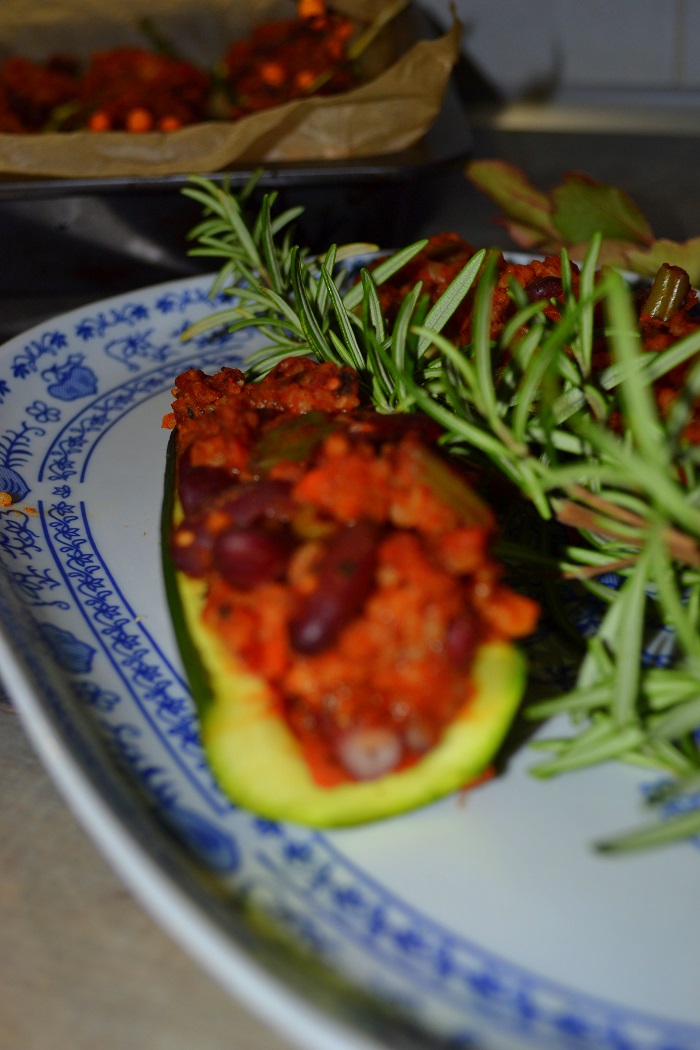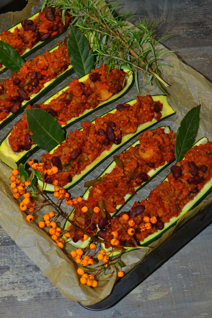 - cukinie dokładnie umyć, przeciąć wzdłuż i wydrążyć nasiona małą łyżeczką- piec 30 minut w 200 stopniach- w tym czasie ugotować kaszę w szklance wody (około 15 minut, jak kasza wchłonie wodę)- na patelnie wyłożyć warzywa i smażyć chwilę, dodać przyprawy i zioła oraz czosnek- smażyć do miękkości warzyw- dodać ugotowaną kaszę, przecier i fasolę. Dokładnie wymieszać- podgrzewać chwilę do połączenia się składników (masa powinna być gęsta)- doprawić solą i pieprzem- wyjąć cukinie. wypełnić farszem i wstawić z powrotem do piekarnika na 15 minut