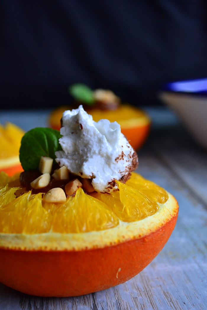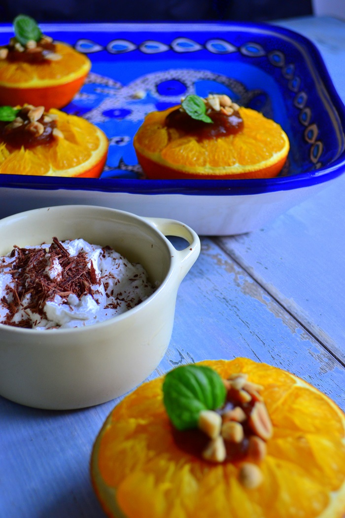 - pomarańcze wyszorować, odciąć z obu stron małe plasterki by pomarańcze stały. Przeciąć owoce na połowę. Piec 30 minut w 180 stopniach