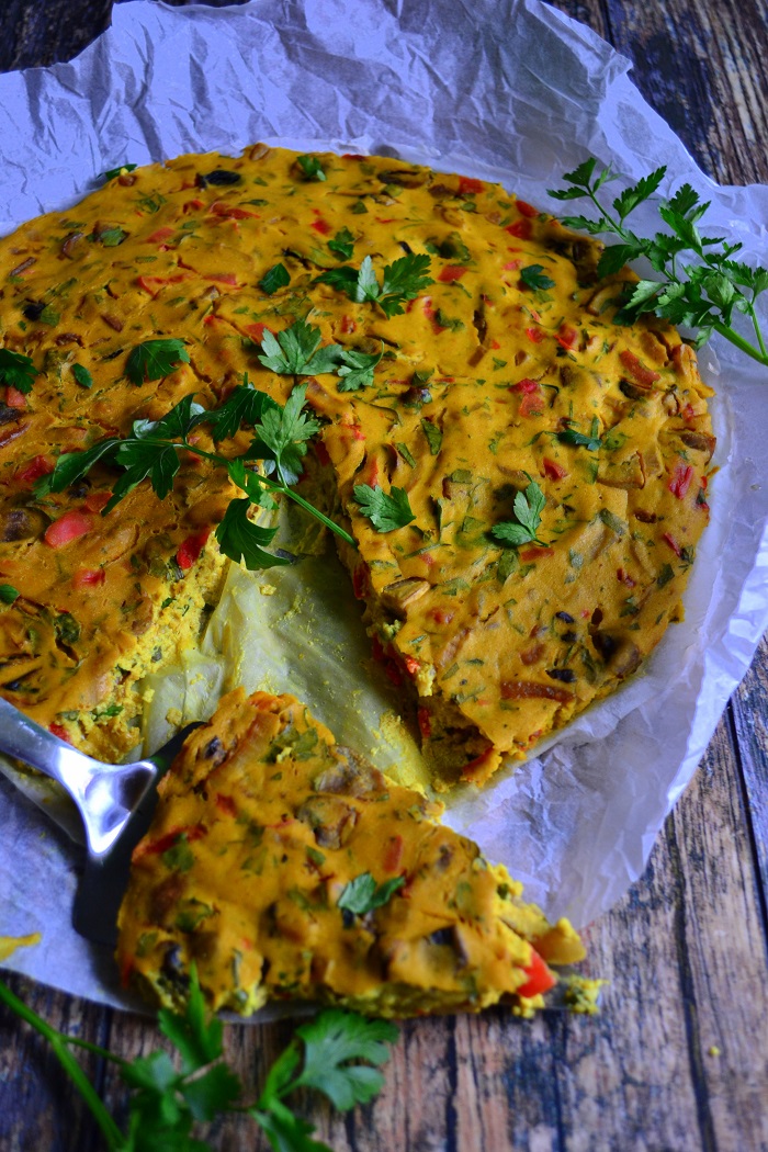 Zmiksowane tofu z mąką kukurydzianą, płatkami drożdżowymi, kurkumą i solą kala namak.
