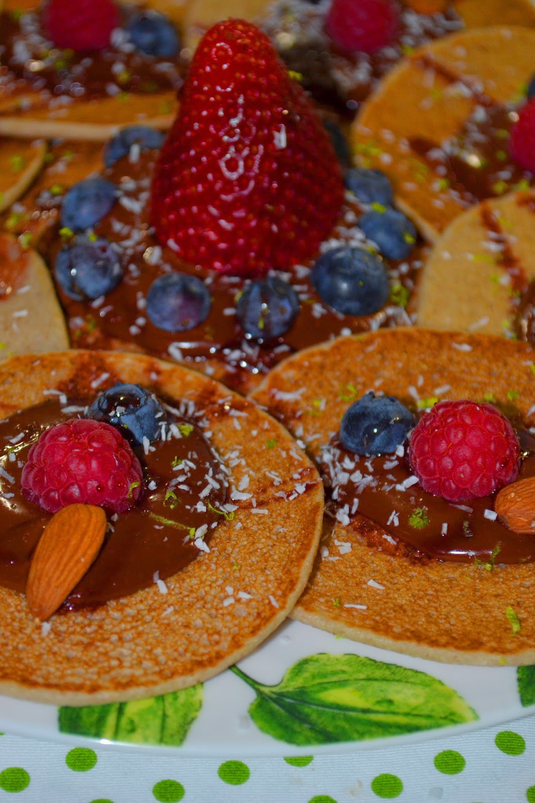 PLACKI ŻOŁĘDZIOWO - GRYCZANE Z KREMEM CZEKOLADOWYM I OWOCAMI