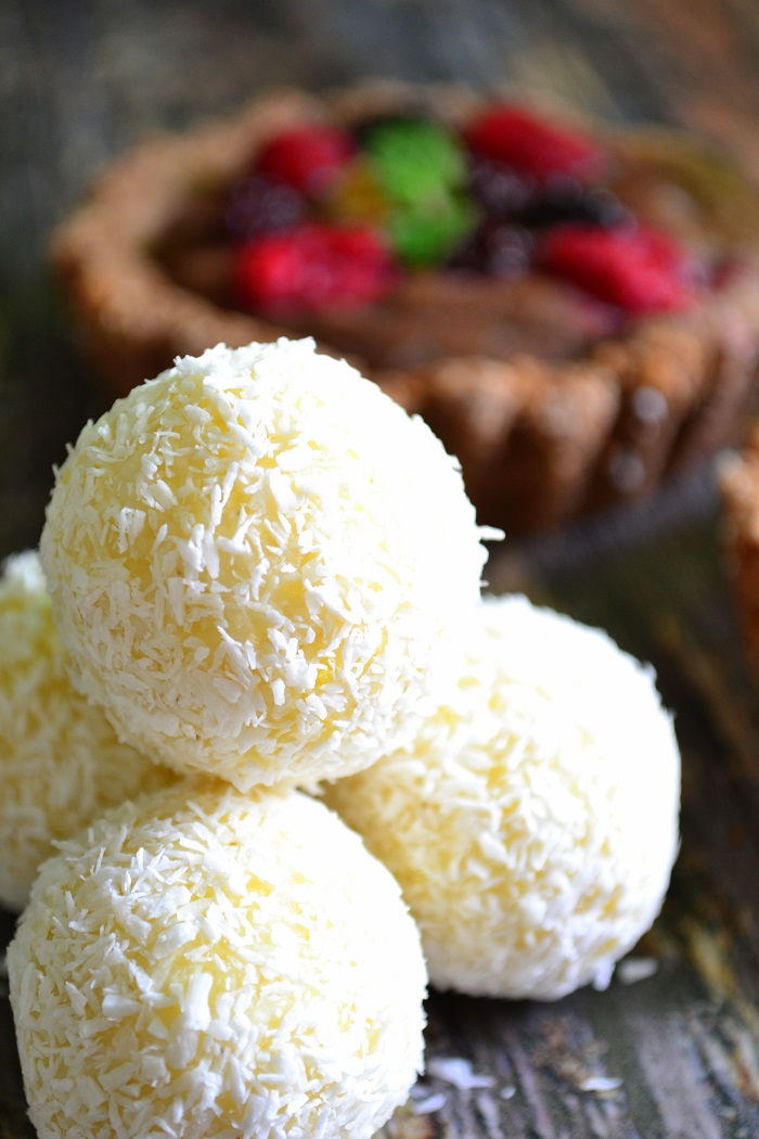 Przygotować też możemy wegańskie rafaello z kaszy jaglanej. Słodkie kulki z ukrytym w środku sercem migdałowym.