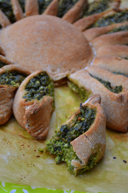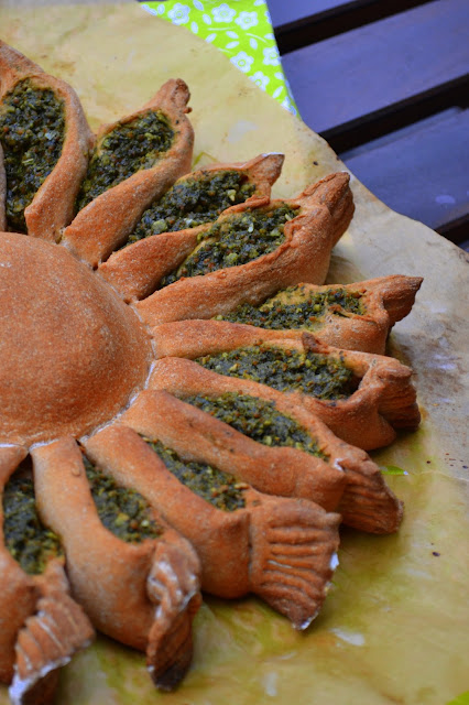 Ciasto drożdżowe z mąki pszennej i pełnoziarnistej orkiszowej. Farsz to mieszanka liści botwiny, bazylii, kopru, natki pietruszki, kolendry, tymianku i oregano. W zasadzie nadzienie to nic innego jak pesto z ziół, słonecznika, oliwy i czosnku. Jest to nowy sposób na botwinkę. Całość farszu łączy kasz jaglana.