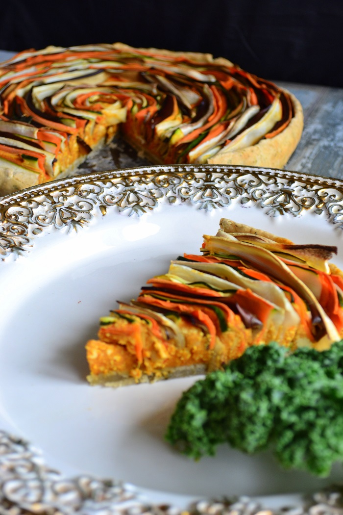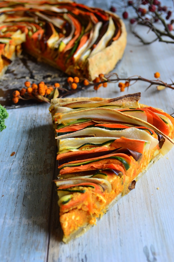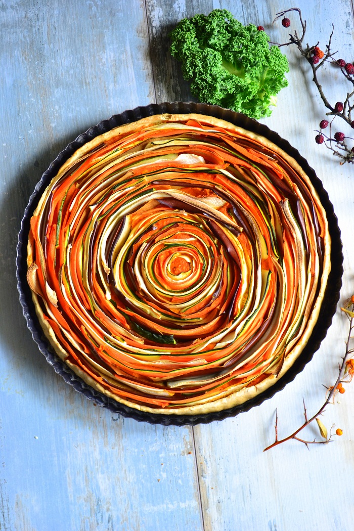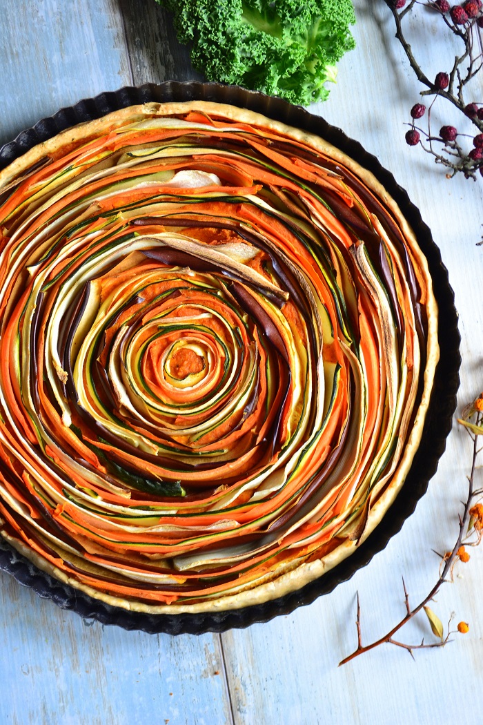 Jeżeli chodzi o warzywa to panuje pełna dowolność. Ja często dodaję również grzyby dla aromatu i zioła. Ta tarta ma warzywa w postaci cienkich pasków, które są zakręcone i tworzą spiralę. Może to nie jest ciąg Fibonacciego, ale wygląda nieźle :)