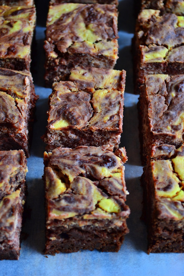 - formę wyłożyć papierem do pieczenia, wyłożyć masę czekoladową a na nią tofurnikową. Za pomocą widelca przemieszać masy (zrobić esy floresy). Forma wielkości 25 na 40 cm.