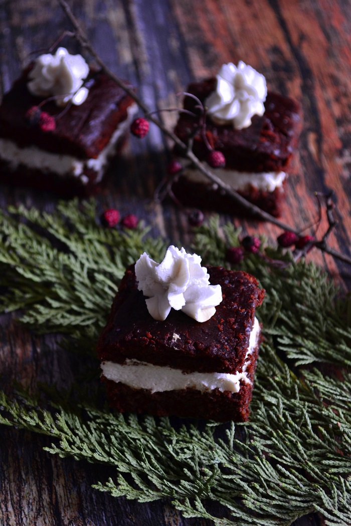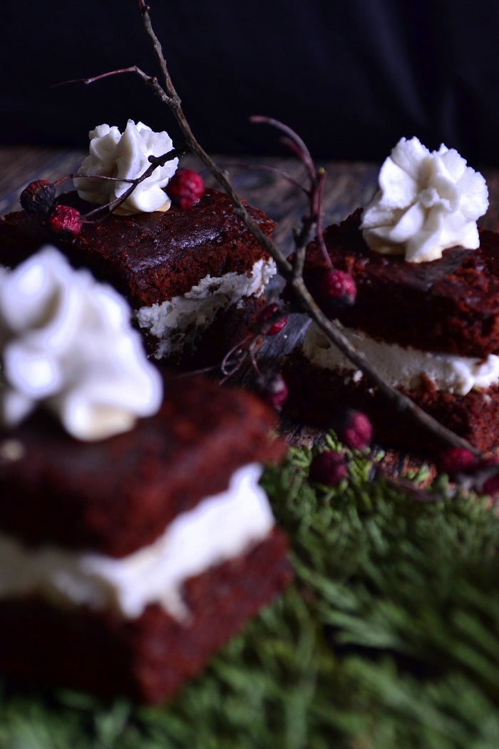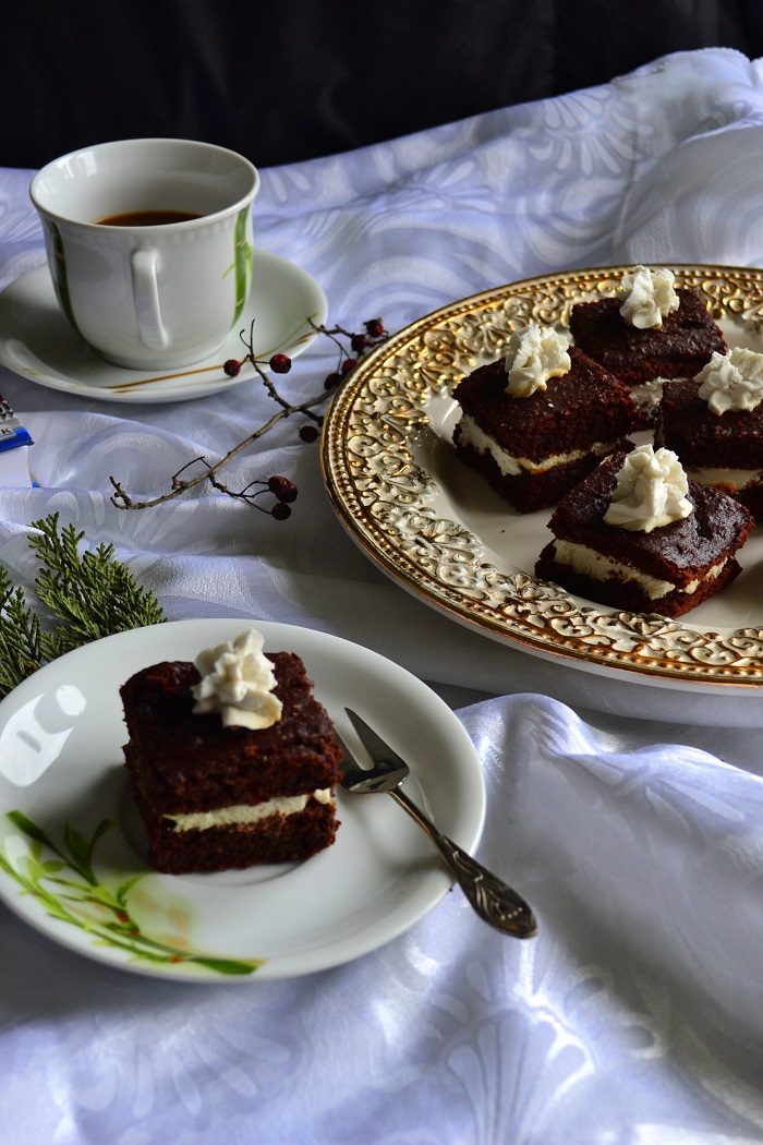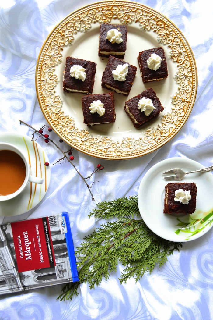 Świetnie się połączyły z resztą składników i nadały super smak. Ciasto lekko się kruszy, ale i tak jest o niebo lepsze od innych moich nieudanych prób. Z racji konsystencji polecam ciasto pokroić na kwadraty i dopiero poprzecinać na pół. Przecięcie całego blatu jest bardzo trudne.