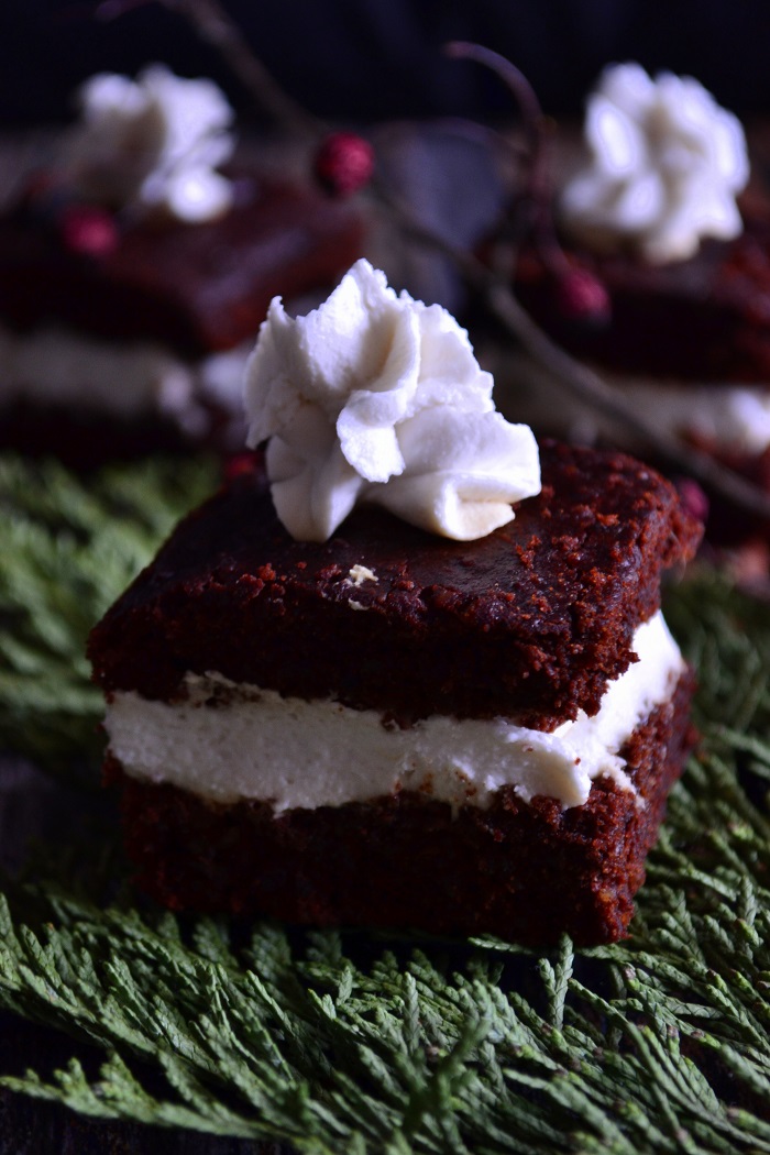 Ciasto nasączane jest kawą, przekładane dżemem z czarnej porzeczki i bitą śmietaną. Wegańska wersja ma kokosową śmietankę.