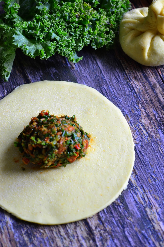 Chinkali w oryginale zawiera mielone mięso z przyprawami. Wersja wegańska zawiera nadzienie nie mniej aromatyczne. Przygotowałem je ze zmiksowanego jarmużu, suszonych pomidorów i zielonych oliwek.