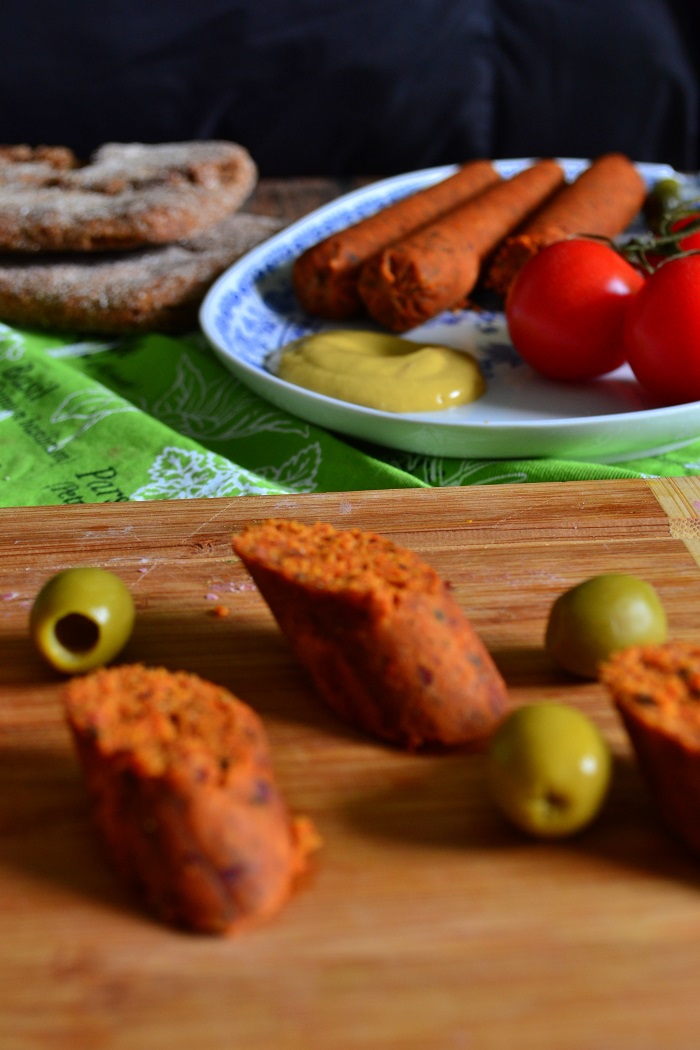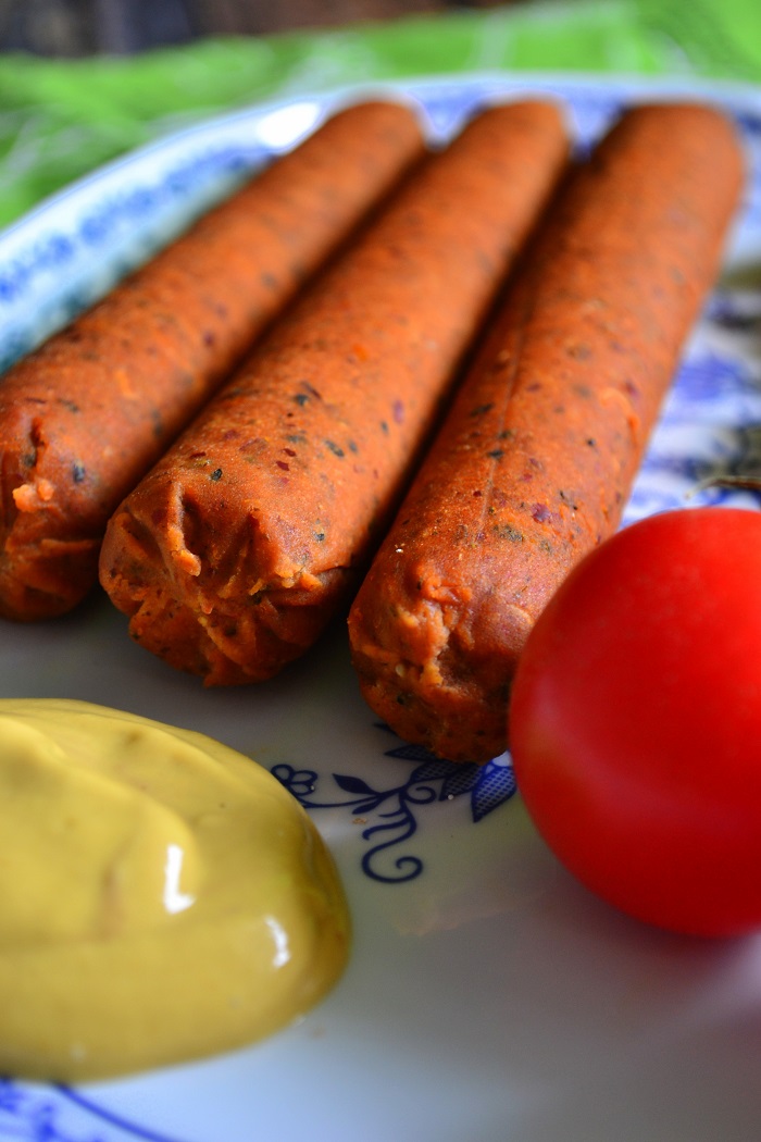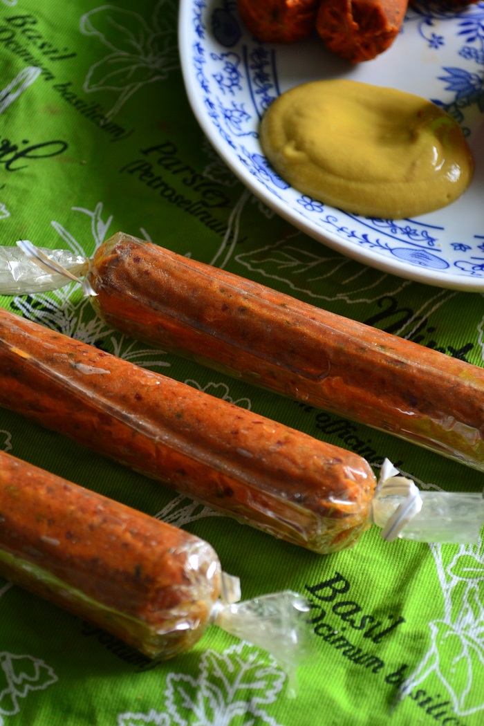 - tofu dokładnie zmiksować blenderem lub malakserem z suszonymi pomidorami (odcedzone z oleju) i fasolą- jałowiec, ziele angielskie i kminek rozetrzeć na proszek w moździerzu- w misce wymieszać zmiksowane składniki, przyprawy, czosnek i mąkę ryżową. Doprawić solą i pieprzem- masę dokładnie wyrobić. Formować parówki. Zawijać w folię, spinać na obu końcach klipsami- można gotować 10 minut we wrzątku lub piec 10 minut w 180 stopniach- odwinąć z folii i gotowe- z masy można przygotować również kiełbaski