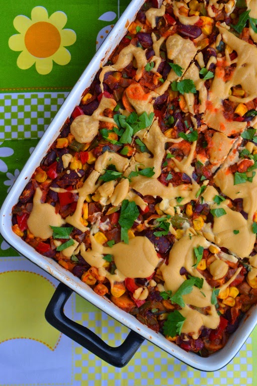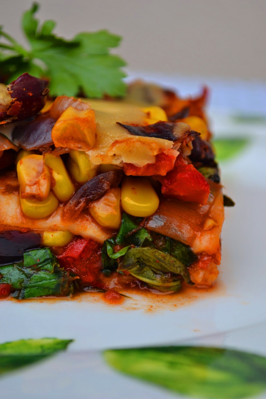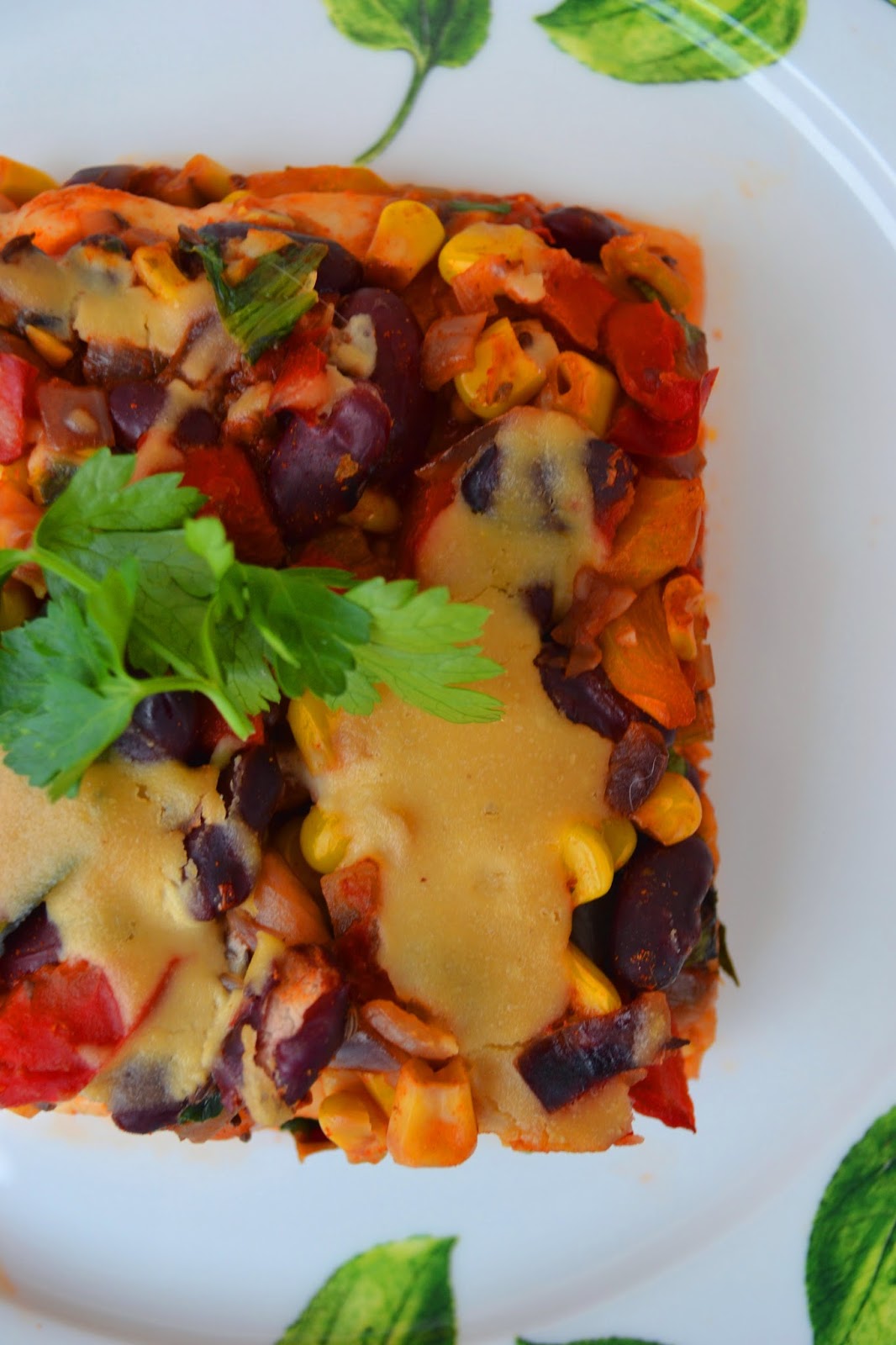 Na dziś polecam prostą i smaczną zapiekankę w stylu meksykańskim. Mieszanka fasoli, kukurydzy, cebuli i grzybów z dodatkiem ostrych przypraw a wszystko przekładane tortillami własnej roboty lub dobrej jakości kupnymi a na wierzchu sos "serowy" z nerkowców i mnóstwo świeżej natki w całości dopełnione sosem pomidorowym :-)