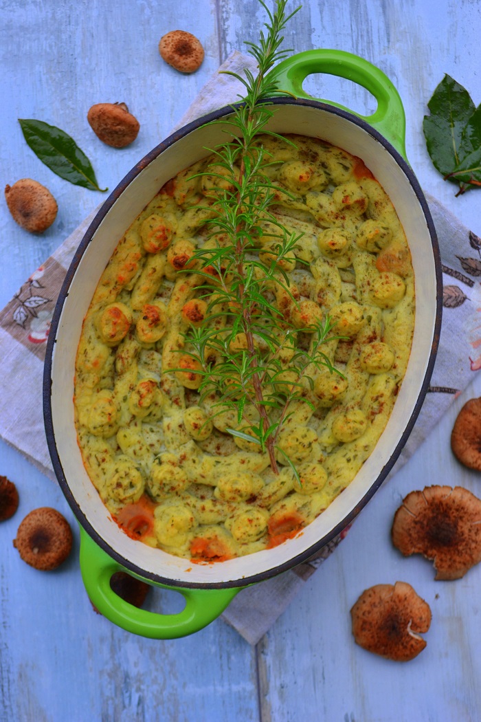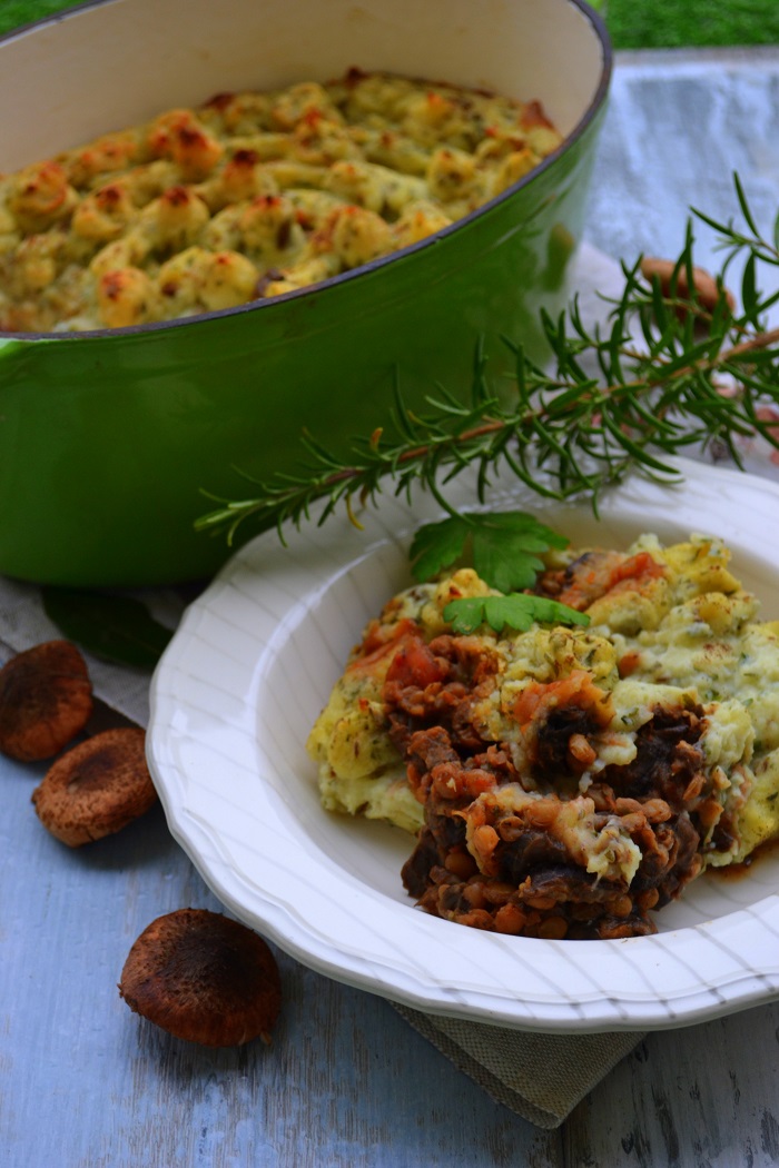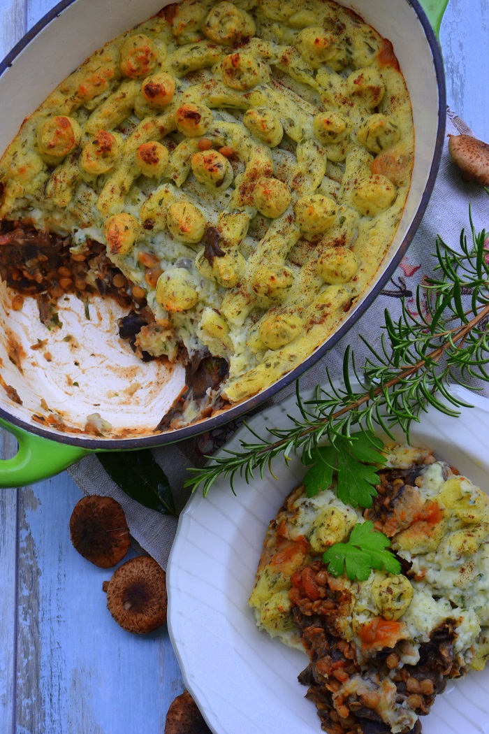 Gęsty sos grzybowy połączyłem z zieloną soczewicą i przecierem pomidorowym. Dodałem przyprawy. Wyłożyłem całość do naczynia do zapiekania (w tym przypadku żeliwny garnek). Wierzch stanowi ziemniaczane puree z wieloma dodatkami. Czasami dziwię się kiedy słyszę, że puree, to tylko ziemniaki, masło i mleko. Moja wersja wegańska, to mleko roślinne, dużo natki i kminku, a także gałka muszkatołowa. Puree musi mieć smak, a nie być zwykłą breją.