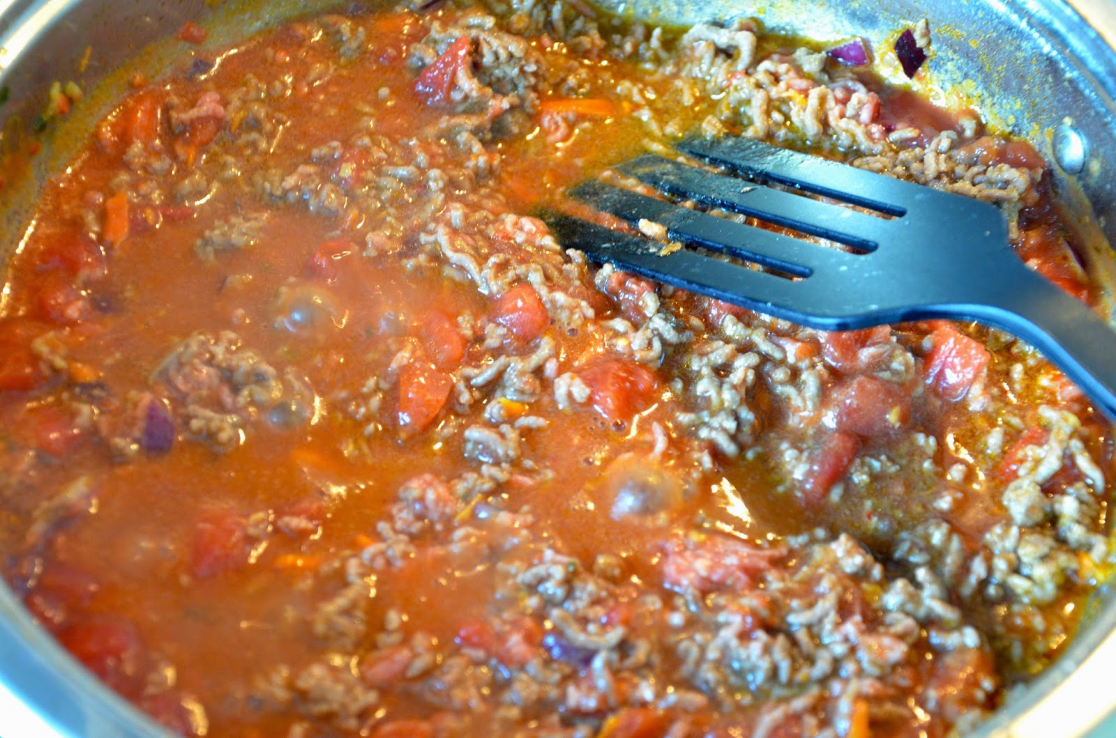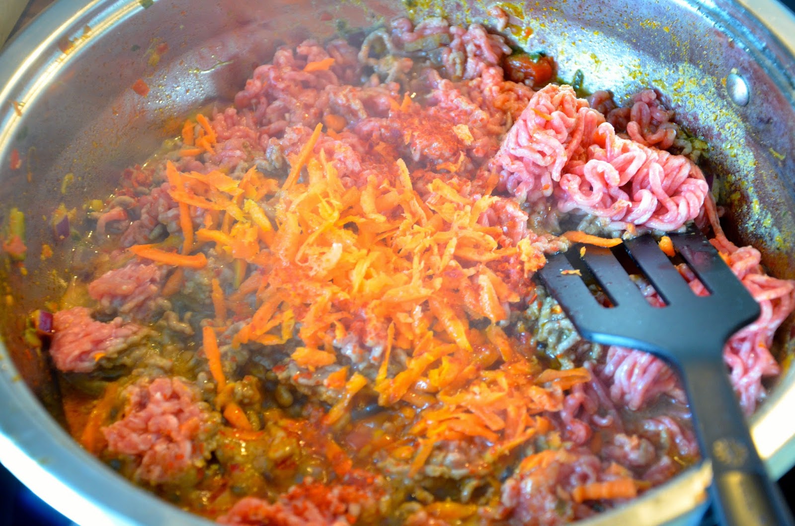 1.Krok:Mięso smażymy na oleju kokosowym. Dodajemy startą marchew i cebulę. Chwilę smażymy i dodajemy pomidory oraz przyprawiamy do smaku.