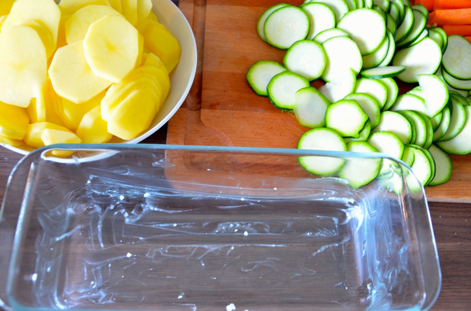 Kiedy mięso się smaży, przygotowujemy sobie cukinię i ziemniaki. Kroimy je na cienkie plastry. Naczynie żaroodporne smarujemy olejem kokosowym.