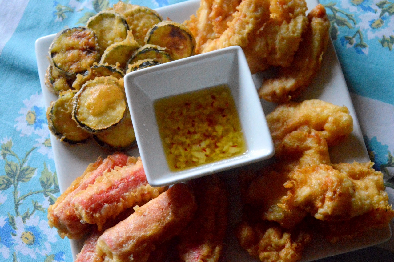 Rozgrzewamy olej w głębokim naczyniu, zanurzamy kolejne składniki w cieście i smażymy na lekko złoty kolor, wyjmujemy i odsączamy na ręczniku papierowym. Przekładamy na talerz i serwujemy z wybranym sosem.