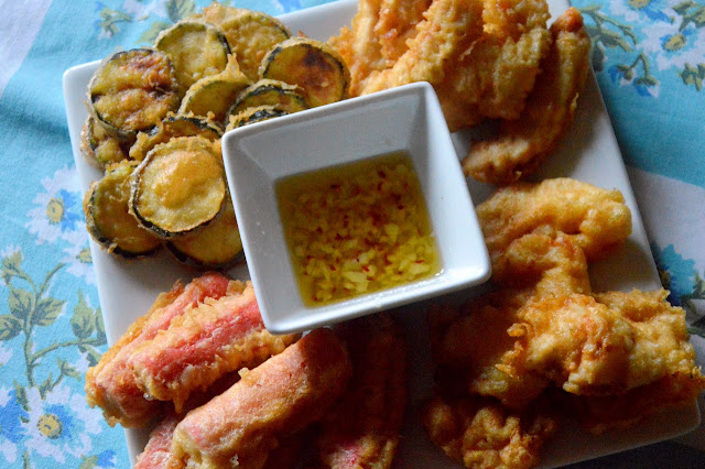 Dzisiaj zapraszam na tempurę z kawałków kurczaka, krewetek, paluszków krabowych i warzyw. Do tego sos słodko-pikantny. Smacznego!