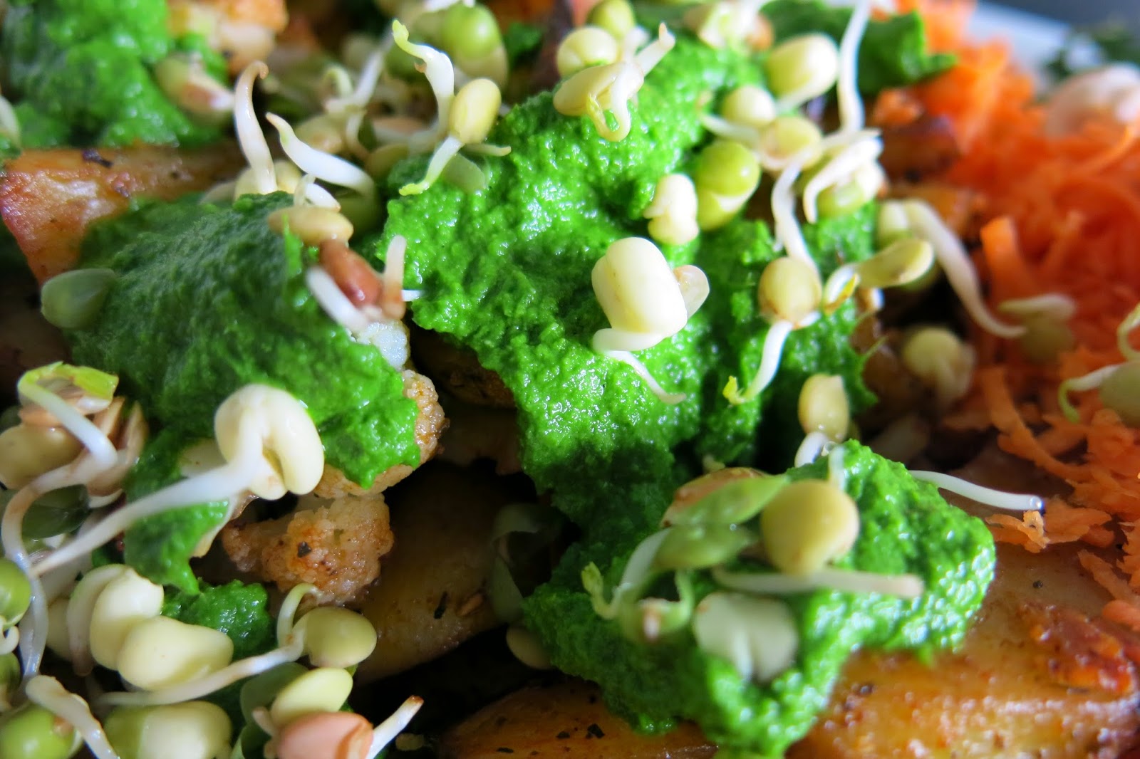 Dookoła surowa marchewka starta na drobnych oczkach tarki, na to wszystko kiełki strączków (soczewica, cieciorka, fasolka mung).