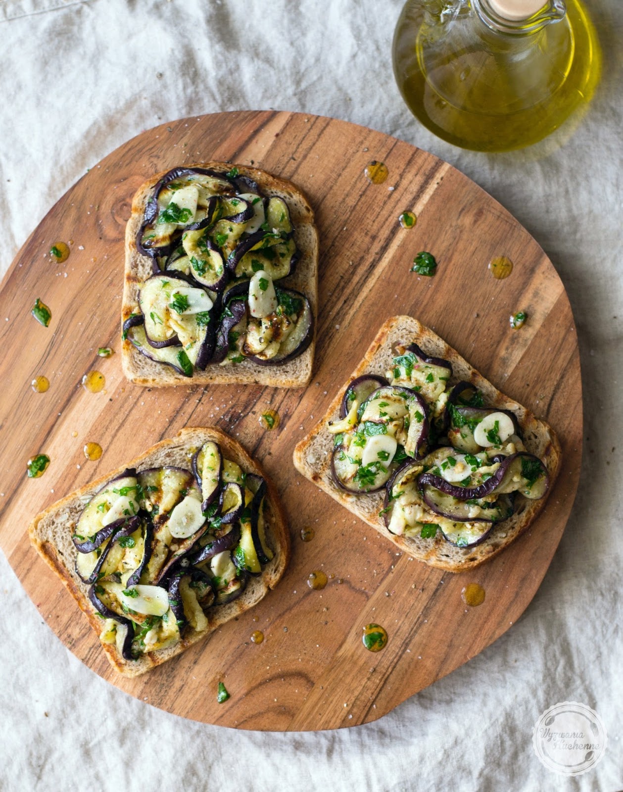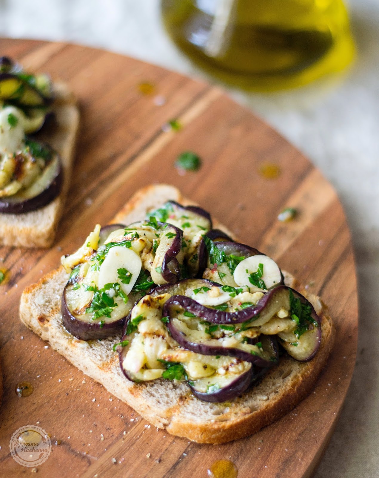 Grzanki, których podstawą jest opiekane pieczywo skropione oliwą i kilka prostych dodatków to szybka przekąska lub przystawka we włoskim stylu. Tym razem przedstawiam Wam bardzo efektowną i apetyczną wersję z grillowanym bakłażanem i pietruszką, Już kilka lat temu odkryłam ten przepis w książce Jamiego Oliviera pt.: "Włoska wyprawa Jamiego" i myślę, że każdy miłośnik bakłażanów będzie nim zachwycony.