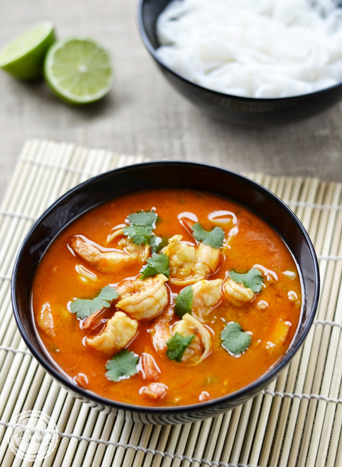 Zupa czerwone curry z krewetkami i tagliatelle z cukinii