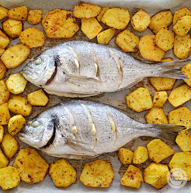 Soczysta dorada pieczona razem z ziemniakami, które można zastąpić innymi warzywami np. marchewką lub batatami. Ryba ta ma tak smaczne mięso, że nie potrzebuje skomplikowanych dodatków a zawsze będzie pysznie :)