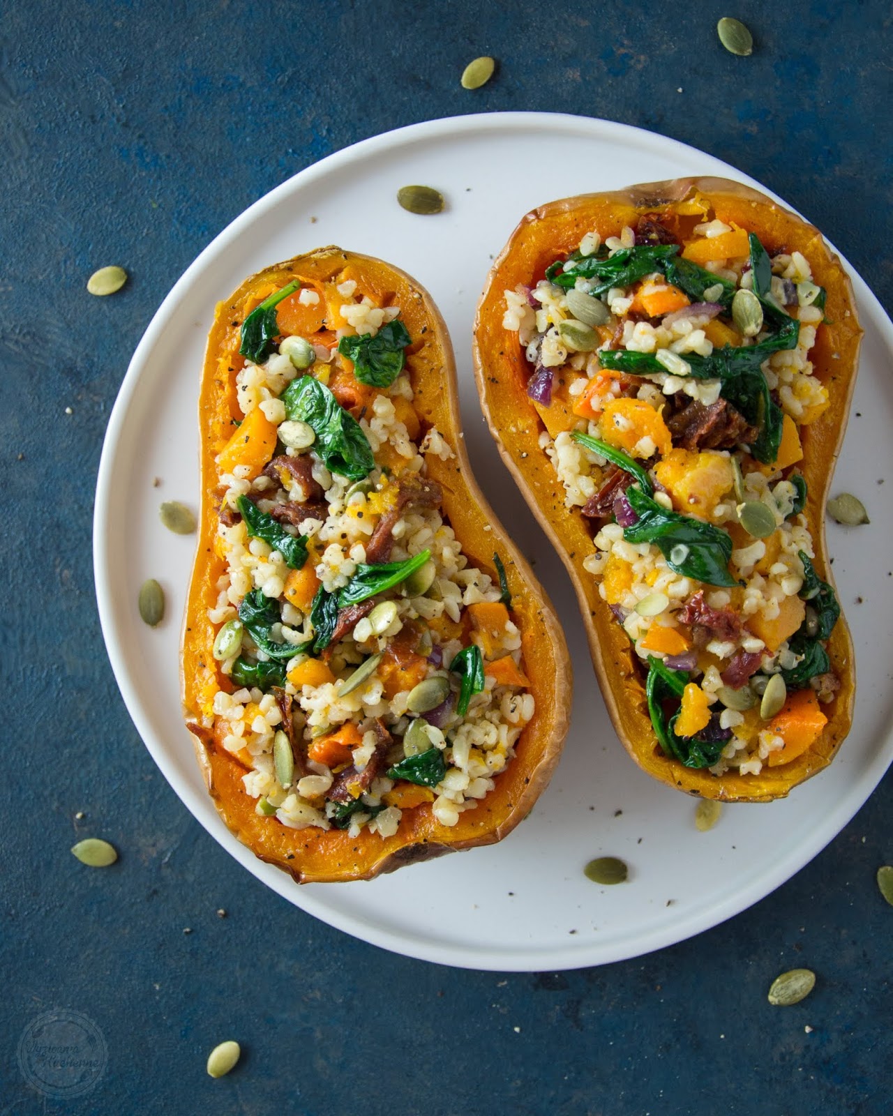 Kolejny przepis z dynią w roli głównej - tym razem mój wybór padł na dynię piżmową. Gatunek ten ma charakterystyczny podłużny kształt, a w smaku jest słodkawy i lekko orzechowy. Do farszu użyłam kaszy bulgur, ale świetnie sprawdzi się tu również kuskus, quinoa a nawet pęczak.