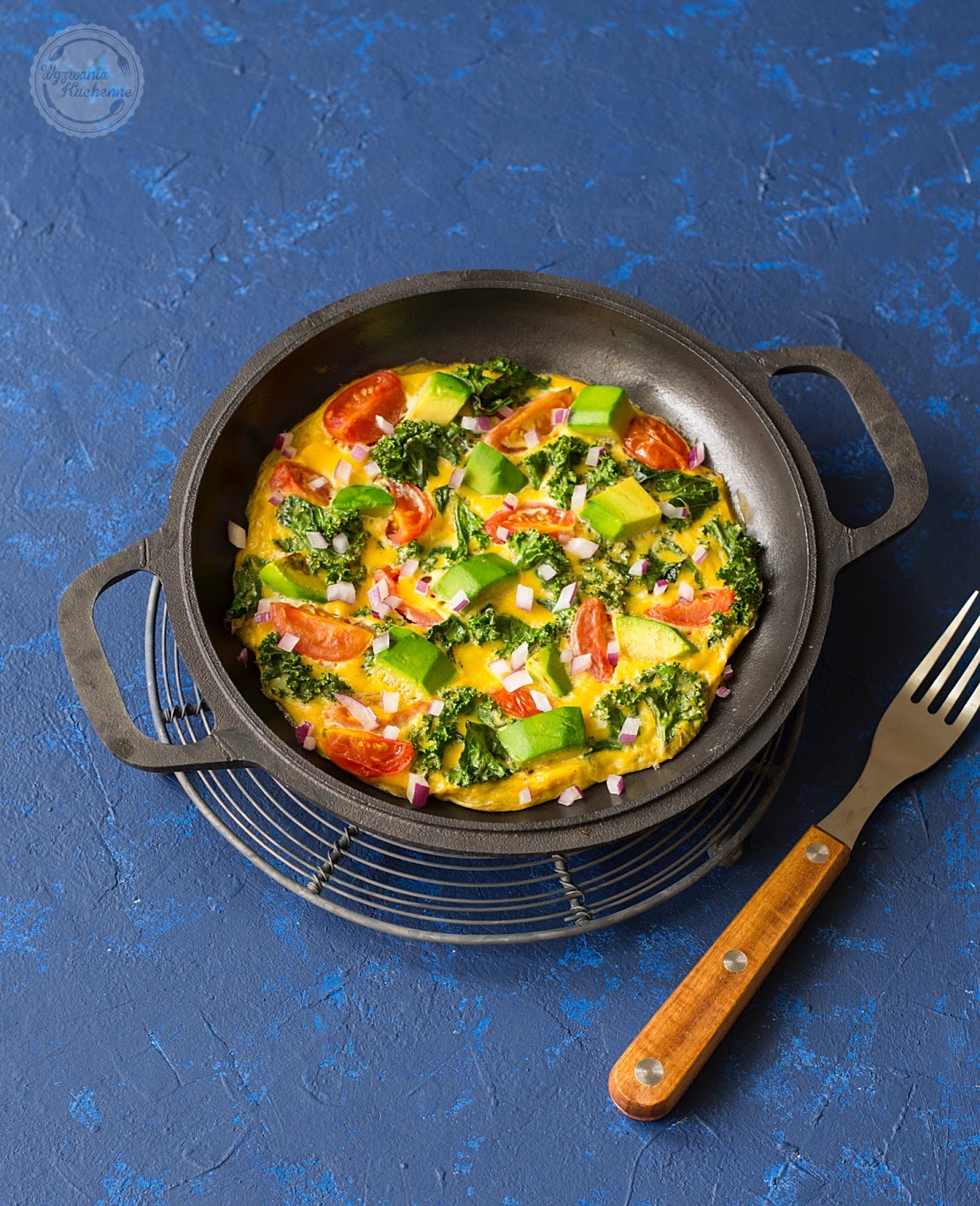 Genialne zdrowe i pożywne śniadanie z przepisu Marka Zaremby z książki pt.:"Leczenie dietą". Włoski omlet zapiekany z chrupiącym pełnym witamin jarmużem oraz kawałkami awokado, które zawiera bardzo dobry tłuszcz. Małe pomidorki i czerwona cebula idealnie dopełniają to sycące danie, które ja polecam również na kolację.