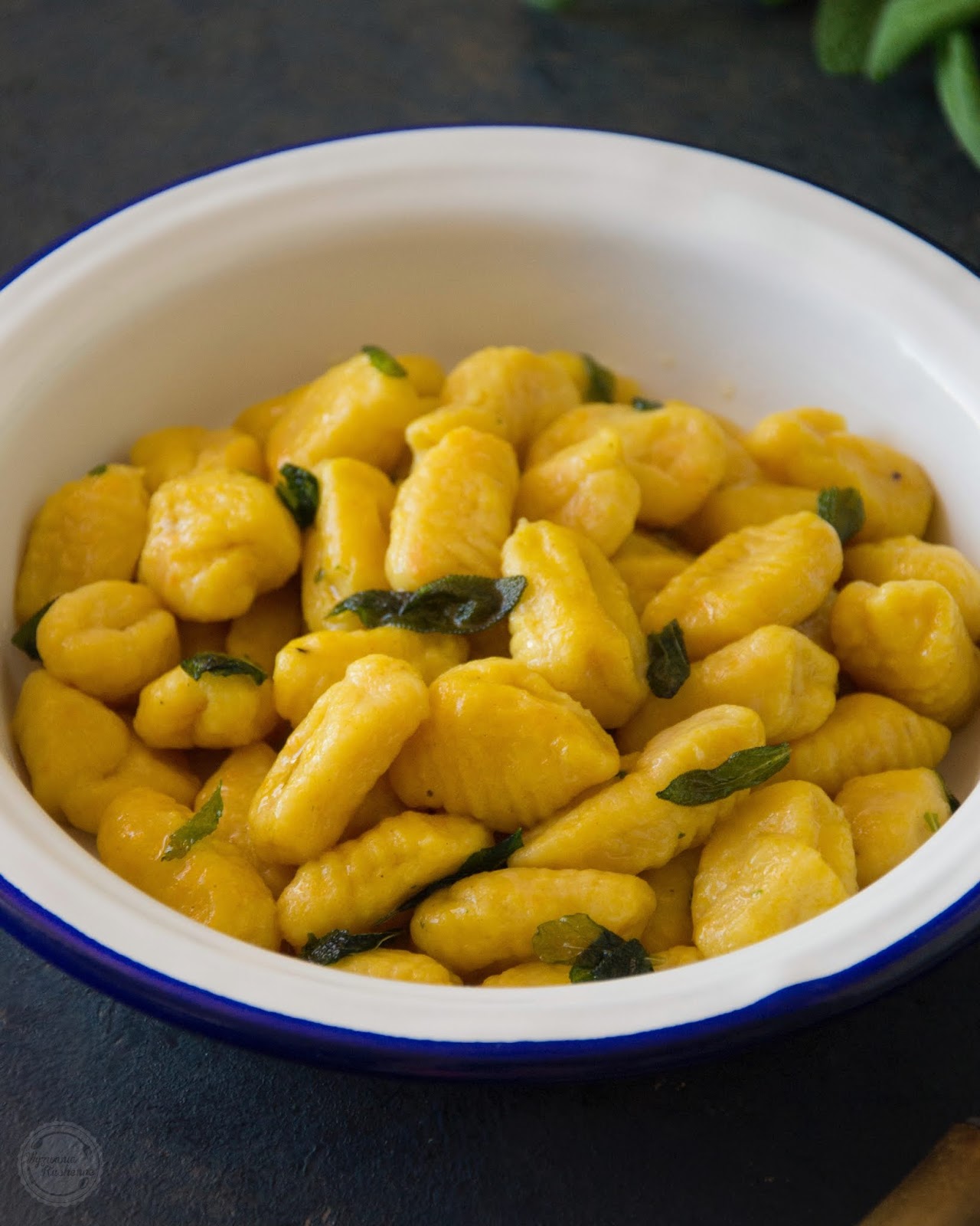 Włoskie kopytka w wersji jesiennej z dodatkiem puree z miąższu dyni, która o tej porze roku jest dostępna w każdym sklepie. Zawdzięczają jej nie tylko ciekawy smak, ale również bardzo apetyczny kolor, który zachęca nawet małym domowników do jedzenia :)