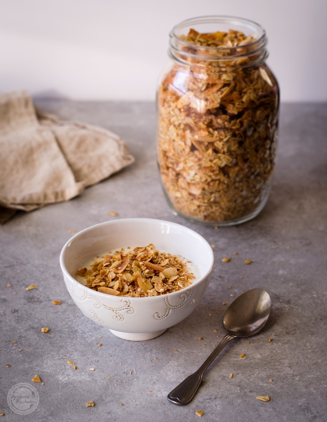 Chrupiąca i krucha domowa granola to zdrowe śniadanie dla każdego. Można ją jeść na wiele sposobów, ale najczęściej z jogurtem naturalnym lub mlekiem. Potrójnie kokosowa dzięki dodatkowi wiórków i płatków kokosowych oraz oleju kokosowego nierafinowanego, który ma cudowny kokosowy smak i zapach.