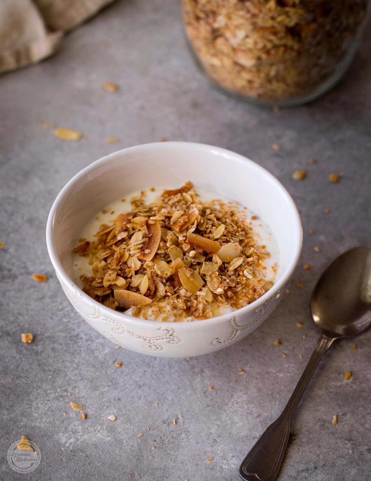 Chrupiąca i krucha domowa granola to zdrowe śniadanie dla każdego. Można ją jeść na wiele sposobów, ale najczęściej z jogurtem naturalnym lub mlekiem. Potrójnie kokosowa dzięki dodatkowi wiórków i płatków kokosowych oraz oleju kokosowego nierafinowanego, który ma cudowny kokosowy smak i zapach.