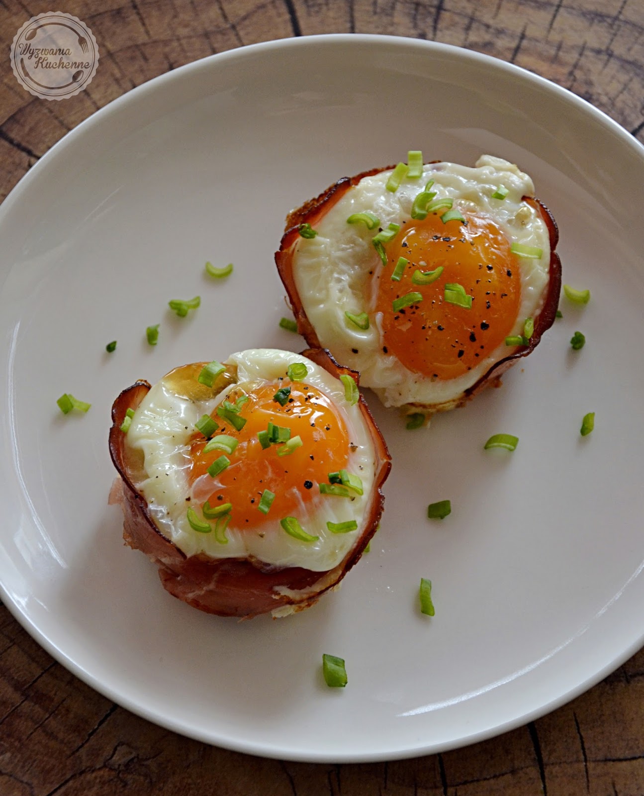 - Formę na muffiny natłuścić oliwą. Wgłębienia wyłożyć plastrem szynki, tworząc miseczkę.