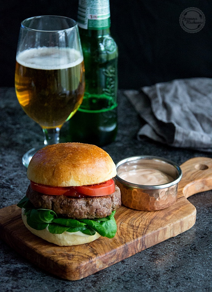 Najbardziej popularny amerykański fast food - klasyczne burgery z mielonego mięsa wołowego, które doprawiamy tylko solą przed smażeniem i ewentualnie pieprzem przed podaniem. Przepis nie jest skomplikowany, a gotowe burgery serwowujemy w opieczonej bułce z sałatą, pomidorem i czerwoną cebulą oraz dwoma sosami.