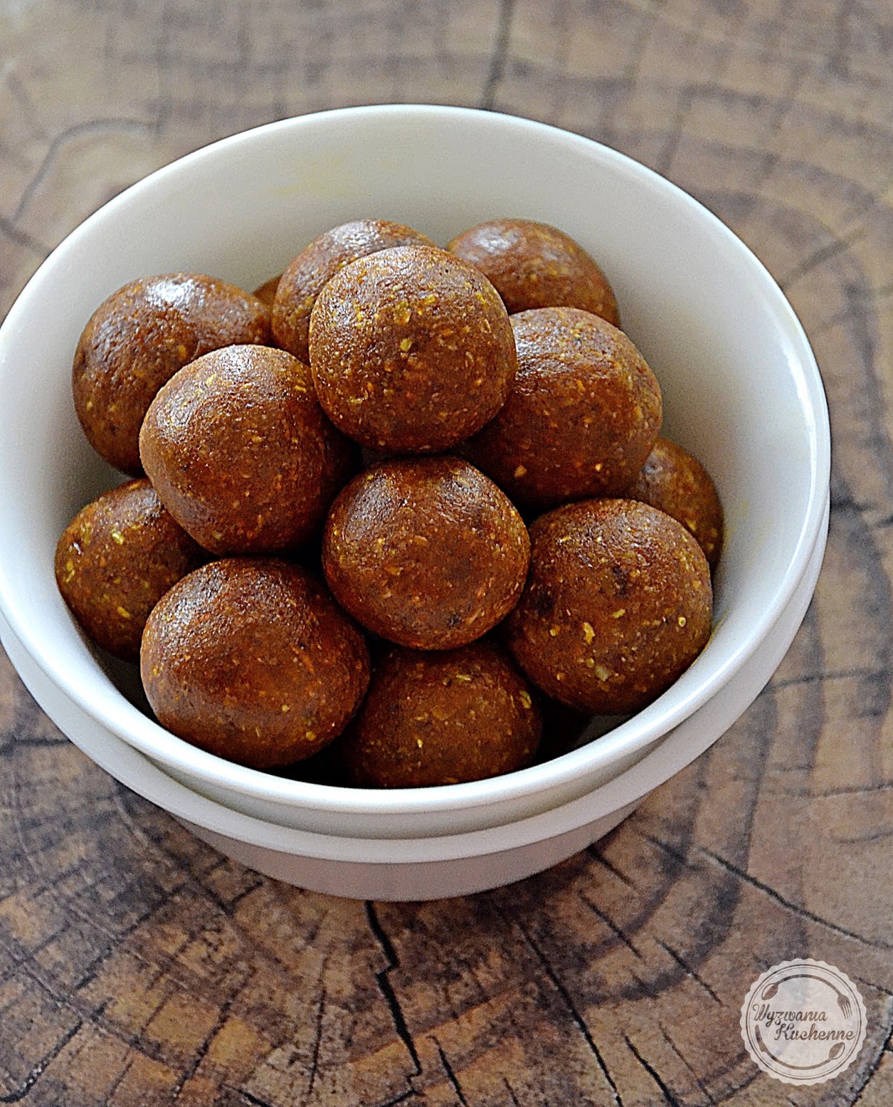 - Wszystkie składniki zmiksować i z powstałej masy ulepić kulki wielkości orzecha włoskiego. Można je dodatkowo obtoczyć w kokosie lub kakao.