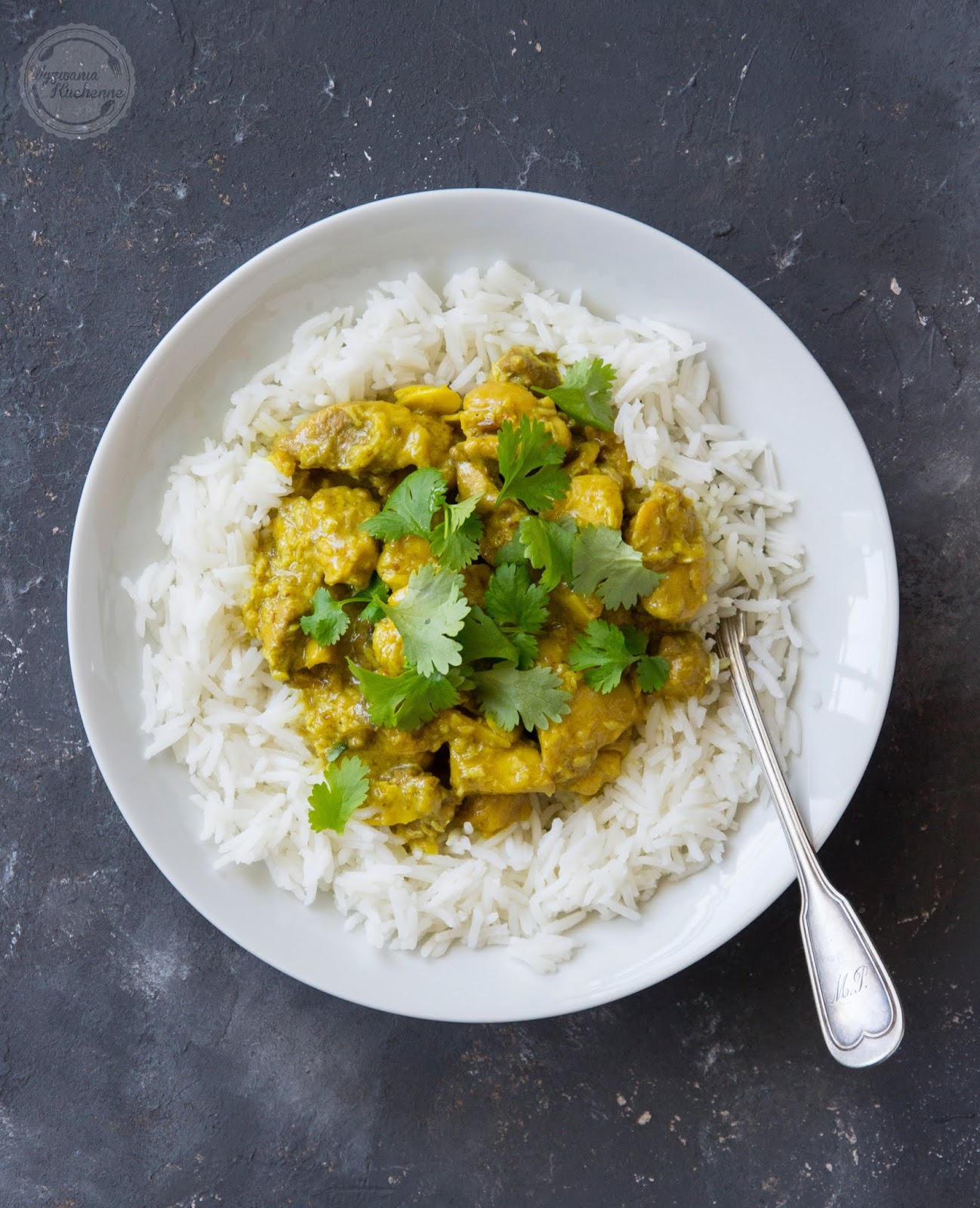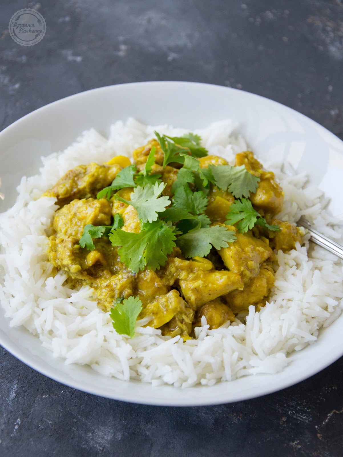 Kurczak w kremowym łagodnym sosie korma to pełne aromatów indyjskie danie, podawane z pieczywem Naan lub ryżem basmati.